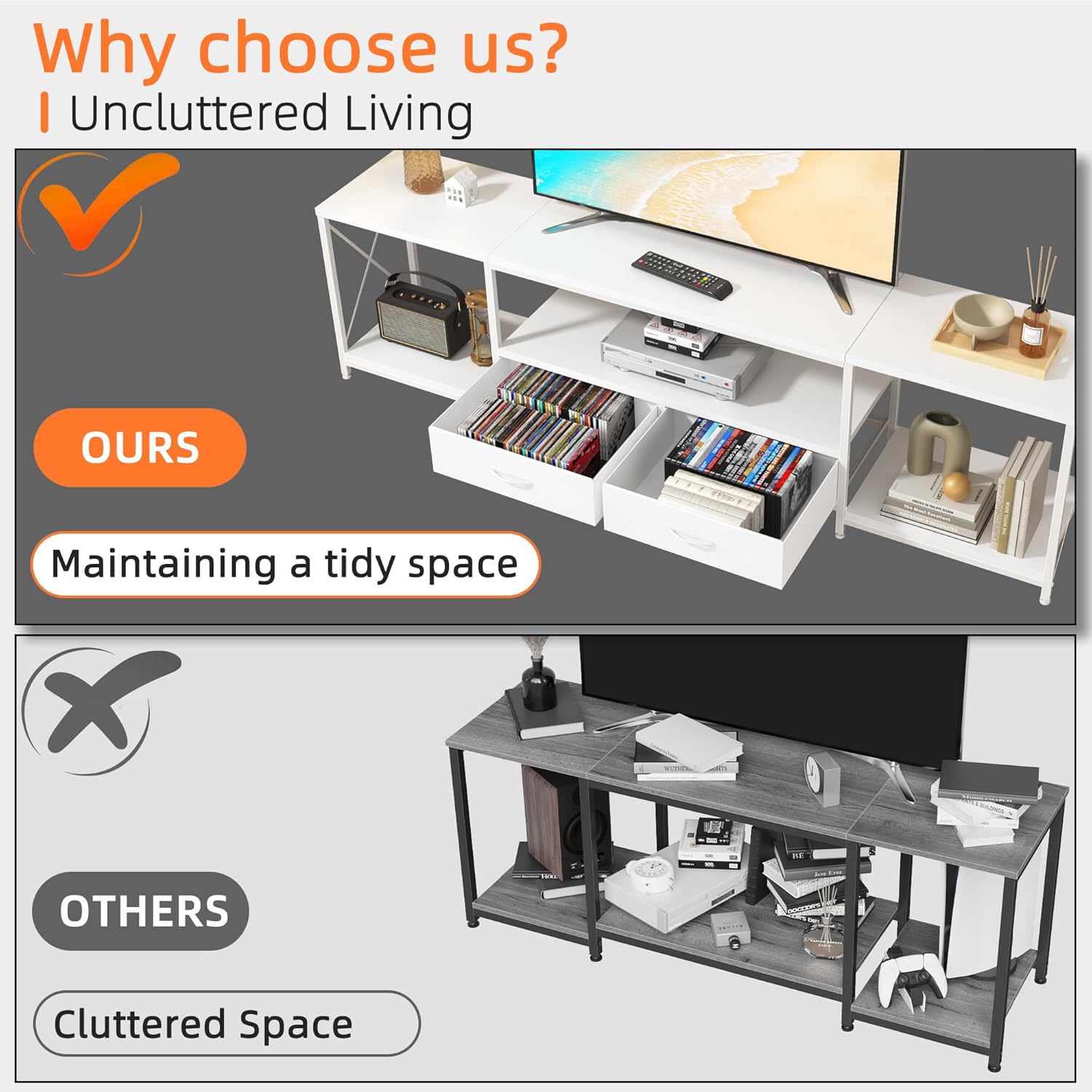 - 【Ample storage space for all your needs】This TV stand provides generous storage capacity, allowing you to neatly organize and store your media devices, DVDs, gaming consoles, and other accessories. Enjoy a clutter-free entertainment area where everything is within reach and well-organized. The board is made of FSC-Certified wood.