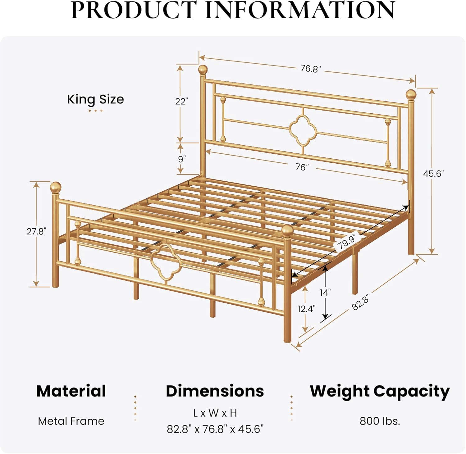 SHA CERLIN 14 Inches King Size Metal Platform Bed Frame/Vintage Iron-Art Headboard and Footboard/Mattress Foundation for Storage/No Box Spring Needed/Noise-Free/Easy Assembly/Gold