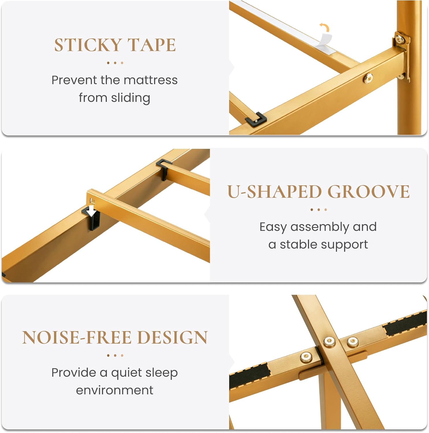 - Noise-Free: The gold bed frame provides an EVA sponge to help cushion the contact between slats and reduce potential noise caused by friction. Greatly improve the quality of sleep by minimizing disturbances from creaking or rattling sounds
