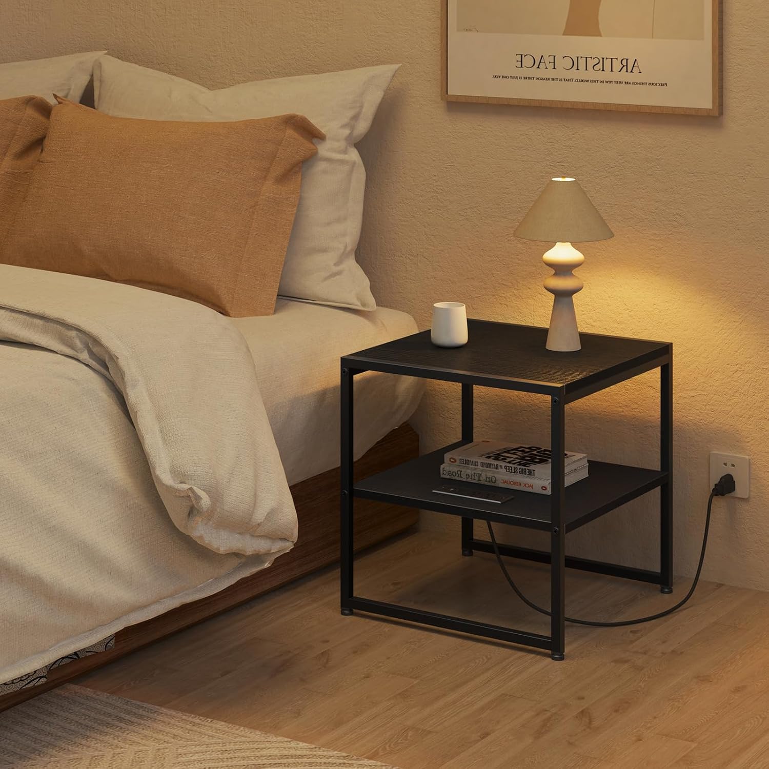 - Versatile Storage Design: This industrial end table with a charging station on the lower shelf keeps your tabletop clutter-free; its metal and wood finish suits living rooms or bedrooms as a nightstand or side table