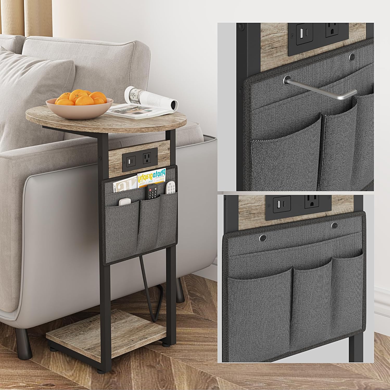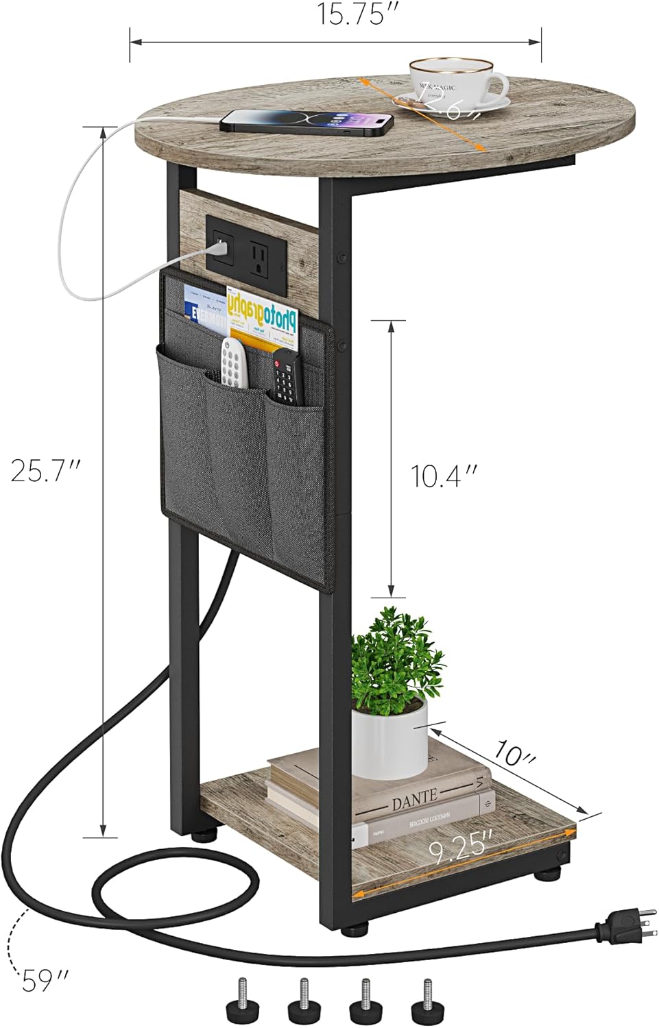 Vagusicc C Shaped End Table with Charging Station, Small Side Table for Couch, Slide Under Sofa Table for Living Room Bedroom, Round Couch Side Table, C Table for Couch Snack Table TV Tray, Greige