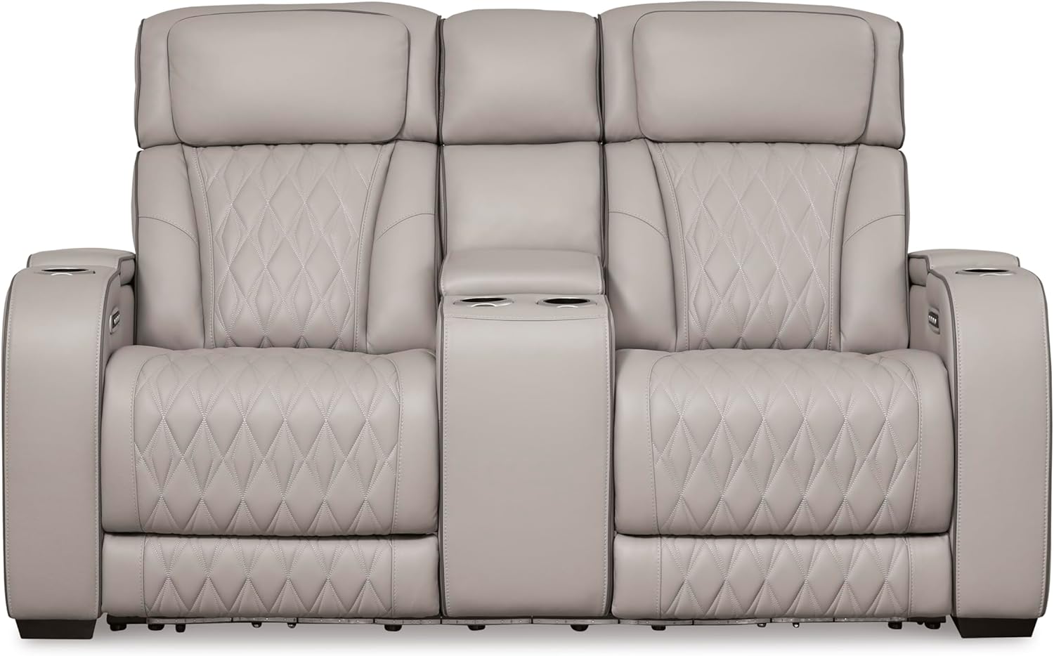 Signature Design by Ashley Boyington Contemporary Leather Match Power Reclining Loveseat with Console and USB Charging Ports, LED Lights and Adjustable Headrest, Light Gray