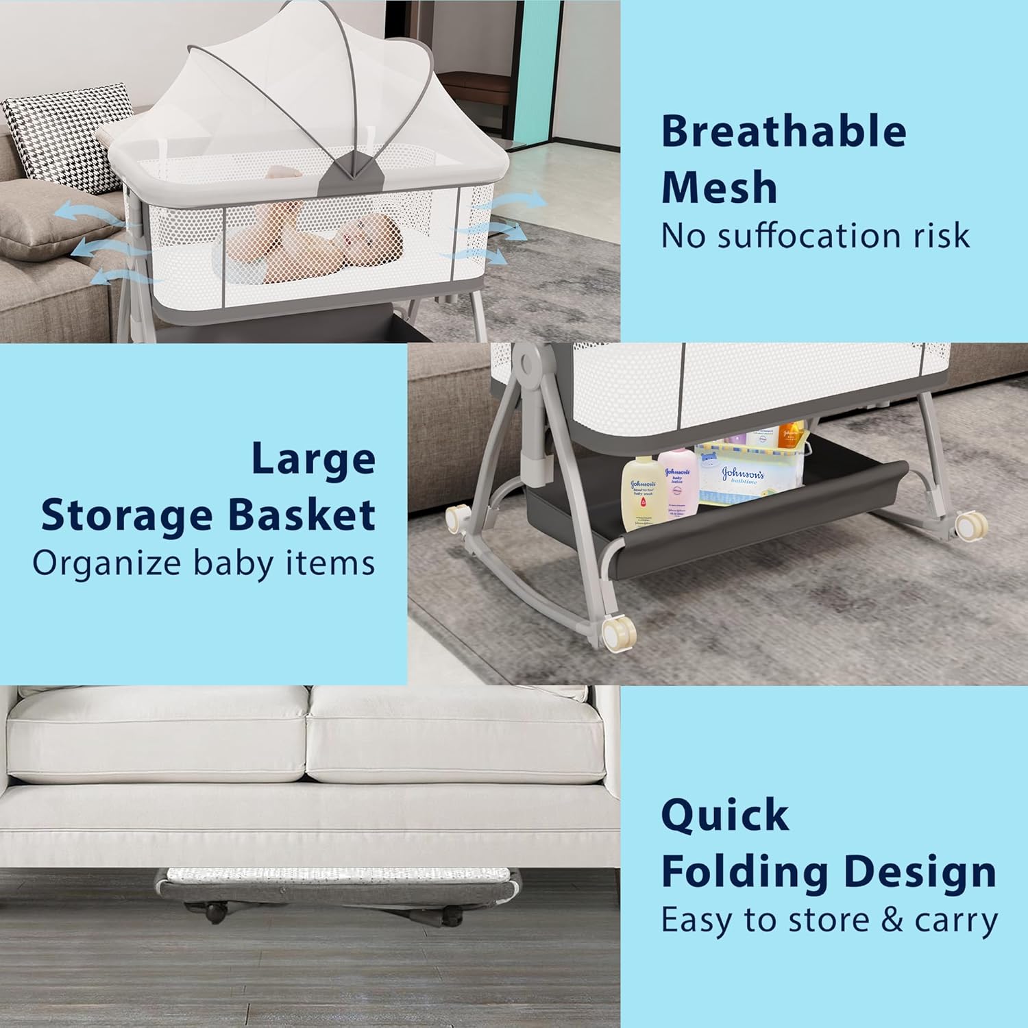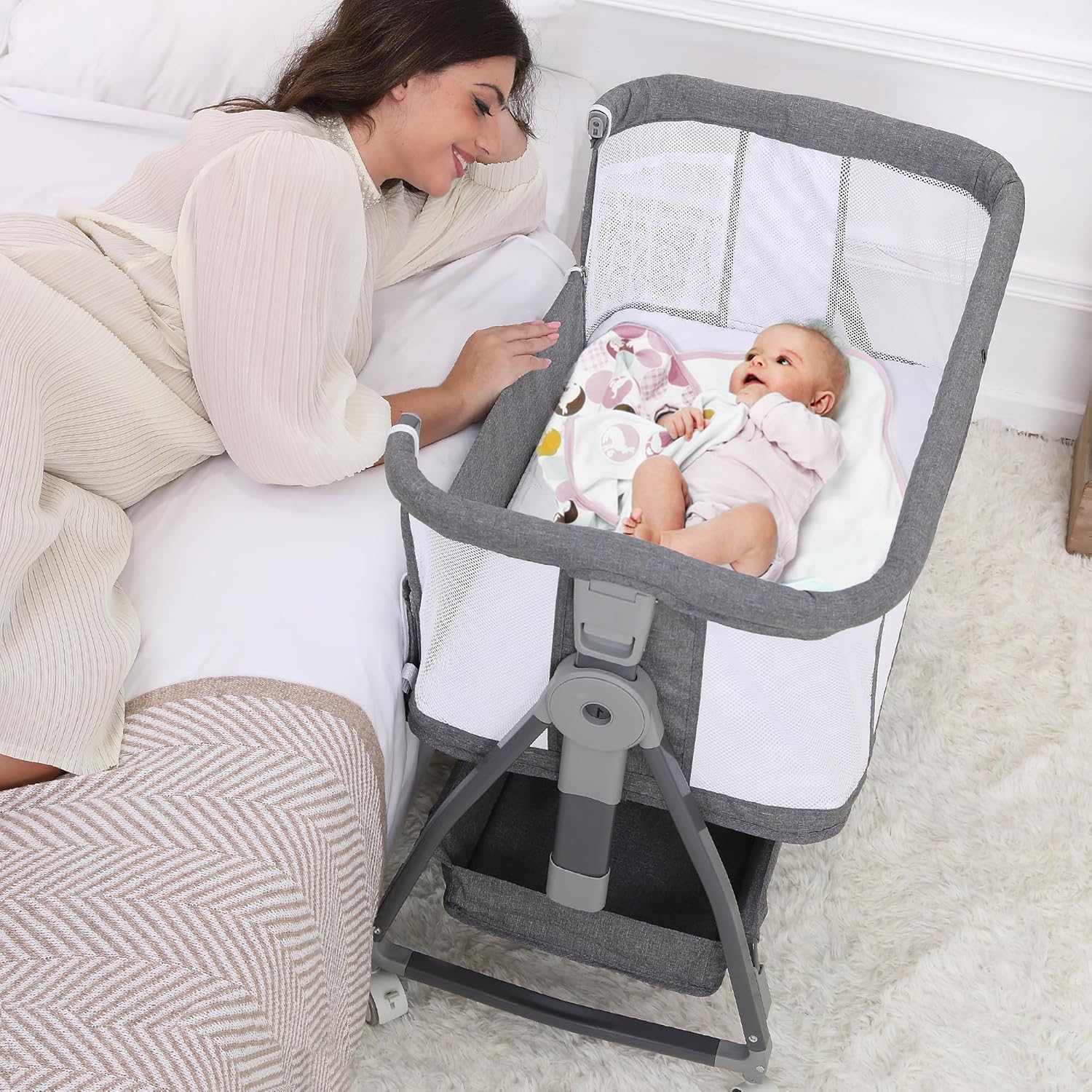 3 in 1 Baby Bassinet Bedside Sleeper with Mattress and Wheels, 5 Height Adjustable Bed Side Bassinets for Newborn, Gray Rocking Bassinet for Baby