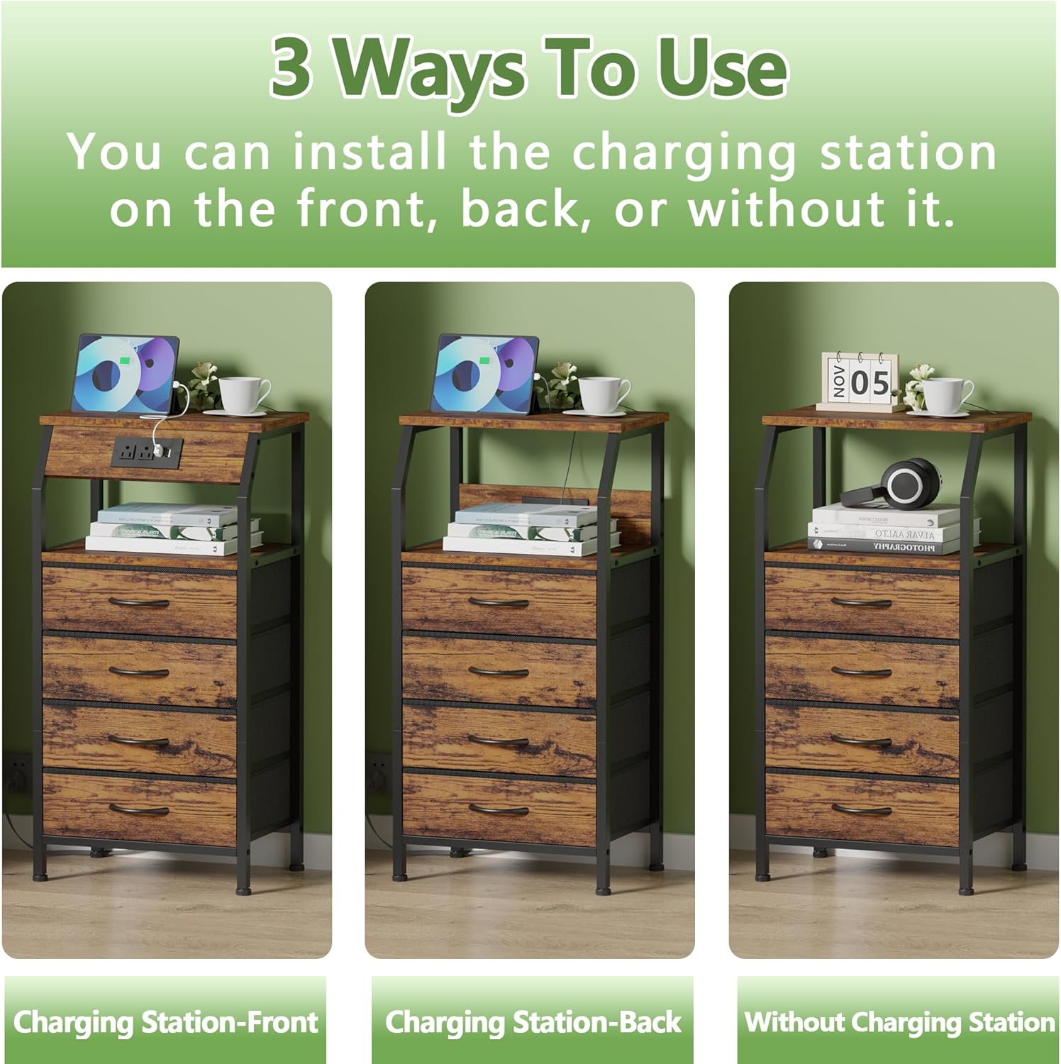 Furnulem Night Stand with Charging Station, Small Dresser with 4 Fabric Drawers, 33.3 Inch Tall Bedside Table, Storage Tower for Closet, Entryway, Bedroom Furniture, 3 Ways to Use, Rustic Brown