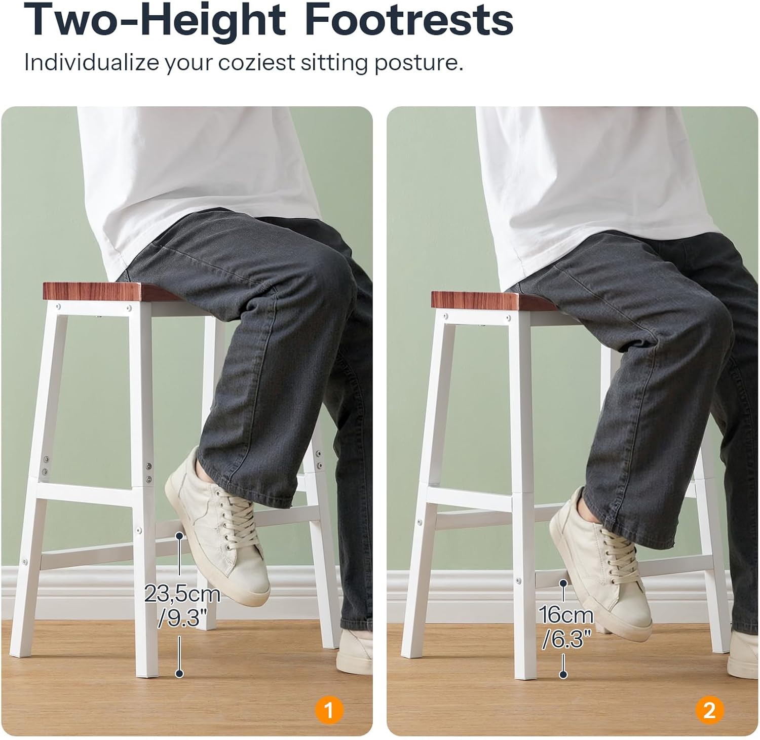 - Two Heights, Same Comfort: The bar stools with footrests can be more stable and beautiful for your each rest because your feet can be supported. You can realize your freedom to adjust the sitting posture in the most comfortable state by putting your feet on one of the footrests in 2 heights and then enjoy the quietness for a while