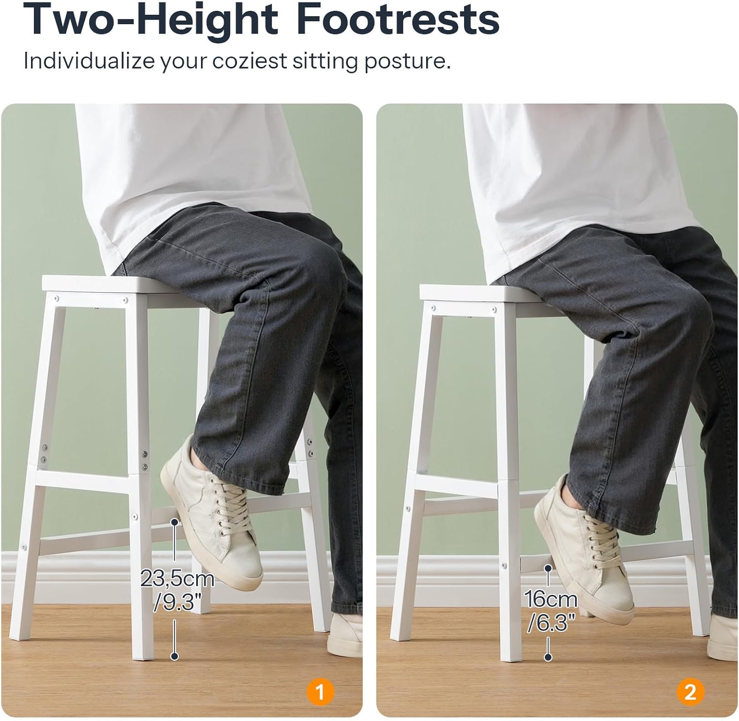 - Two Heights, Same Comfort: The bar stools with footrests can be more stable and beautiful for your each rest because your feet can be supported. You can realize your freedom to adjust the sitting posture in the most comfortable state by putting your feet on one of the footrests in 2 heights and then enjoy the quietness for a while