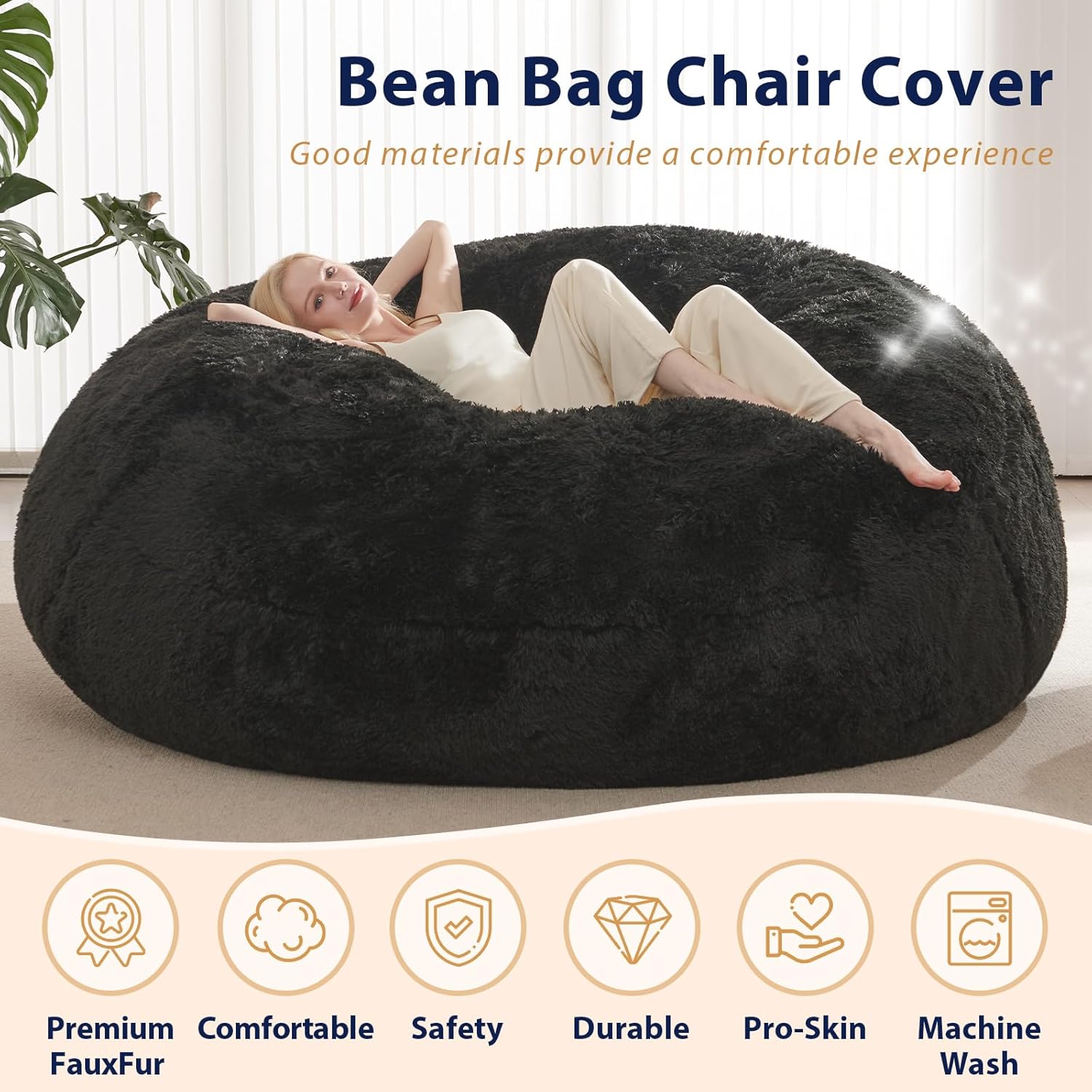Bean Bag Cover (No Filler), Faux Fur Comfy Bean Bag Covers for Adults, Washable Beanbag Chair Cover, Fluffy Plush Giant Bean Bags Chairs Covers for Teens Kids Girls, Anti-Slip, 5FT, Black