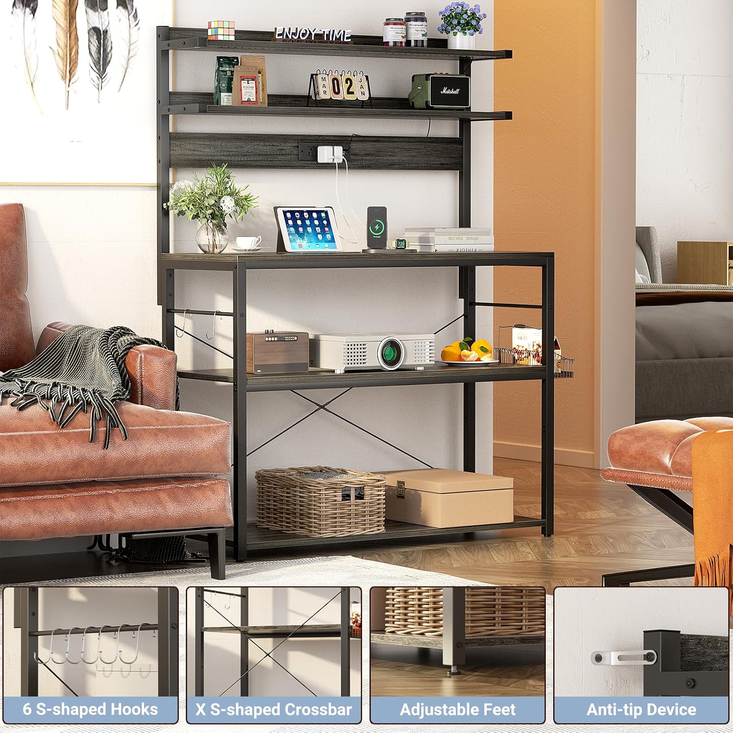 Aheaplus Bakers Rack with Power Outlet, Microwave Stand, 5 Tiers Coffee Bar Station with Led Lights, Kitchen Storage Shelf with 6 S-Shaped Hooks, Kitchen Rack Coffee Bar Stand, Grey Oak