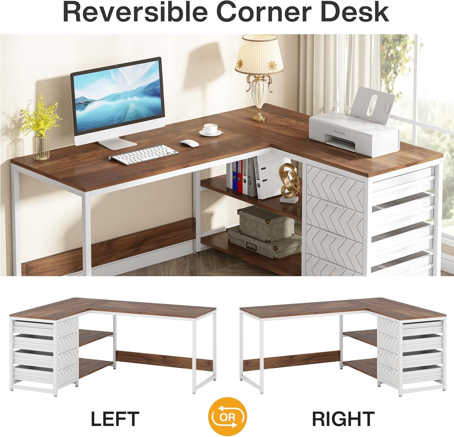 - Multi-functional L Shaped Desk: Brimming with industrial charm, walnut veins panels and white frame, white drawer finish for a decorative touch, which can be blend with any scene of your home office. Served well as a computer table, home office desk, study table, writing desk or executive desk...