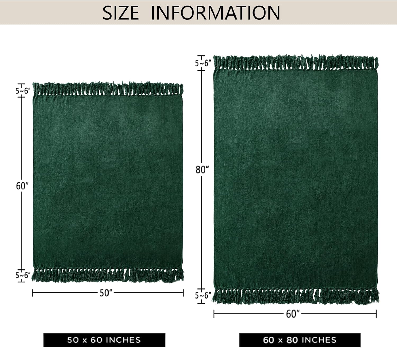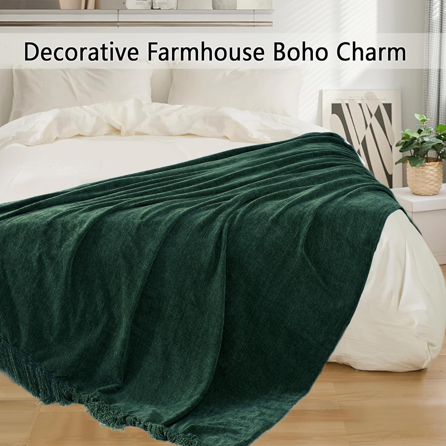 Chenille Throw Blanket for Couch 50"X 60", Soft Cozy Throws with Fringe Tassel for Bed Sofa Chair Cover, Lightweight Knitted Decorative Boho Blankets for Living Room, Dark Green