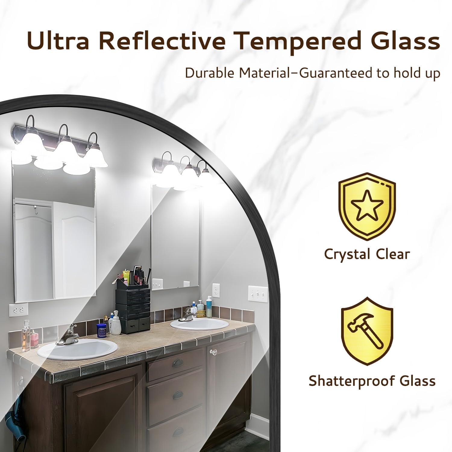 - 💎Shatterproof HD MIRROR: Bathroom top circular mirror with premium 6-layer shatterproof float glass provides a clear, undistorted reflection to the wall mounted circular mirror. The back is covered with explosion-proof film to prevent splashes when broken by external force.