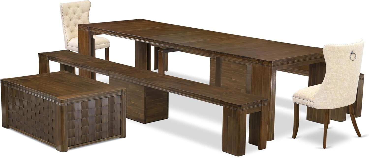 X02DA-2C8-32 6-Pc Dining Table Set includes an Extendable Rectangle Kitchen Table, 1 Coffee Table, 2 Polyester Dining Chairs and 2 Benches, 39x120 Inch, Antique Walnut