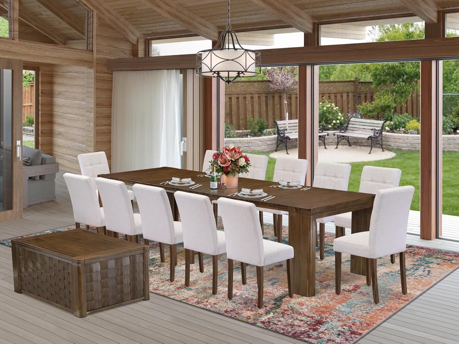 - EXPANDABLE DINING SET FINISH: Our dining and coffee tables feature sophisticated Antique Walnut tabletops and legs that seamlessly complement each other. The dining chairs offer a comfortable seating experience, adorned with opulent Light Gray Polyester Fabric upholstery, beautifully coordinated with matching Antique Walnut legs, resulting in a cohesive appearance across the entire set.