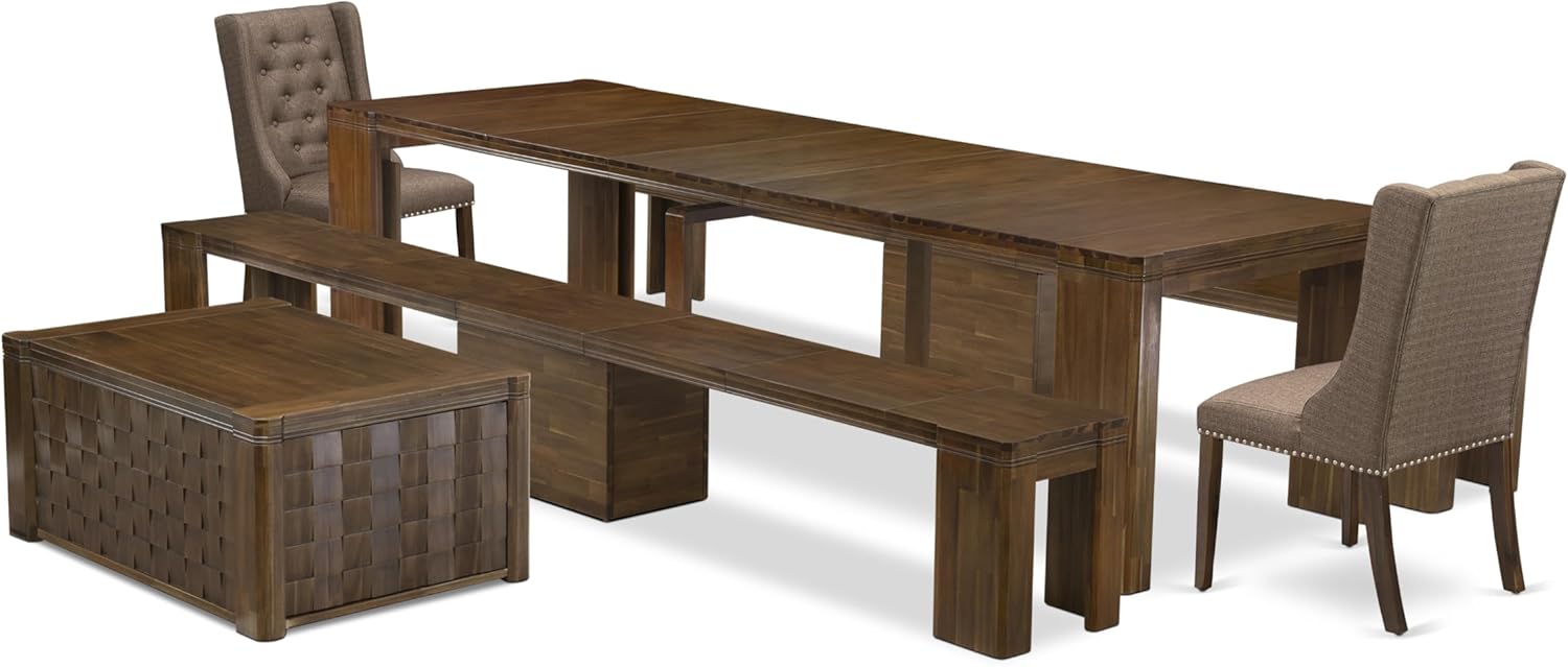 X02FO-2C8-18 - 6 Pieces Dining Table Set includes an Extendable Rectangle Kitchen Table, 1 Coffee Table, 2 Dining Chairs and 2 Modern Benches, 39x120 Inch, Antique Walnut