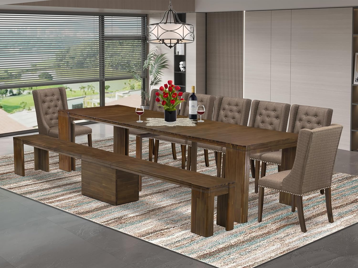 - VERSATILE DINING SET FINISH: The versatile dining table showcases Antique Walnut tabletops that seamlessly integrate with its intricately crafted legs. The dining chairs provide sumptuous and comfortable seating, embellished with Brown Linen Fabric upholstery that effortlessly complements the matching Antique Walnut legs. Similarly, the bench seats retain their timeless Antique Walnut finish, elevating the overall appearance of the entire dining set with a unified and sophisticated aesthetic.