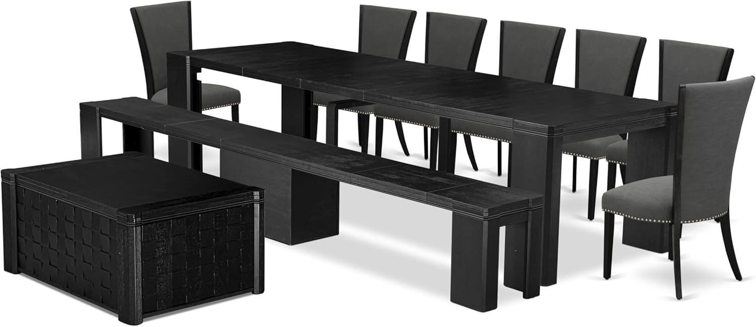 X07VE-BC6-50 - 10-Pc Dining Table Set a Kitchen Table with a coffee Table and wooden Bench & 7 Dark Gotham Grey Linen Fabric Dinner Chair, 39x120 Inch, Wire Brushed Black