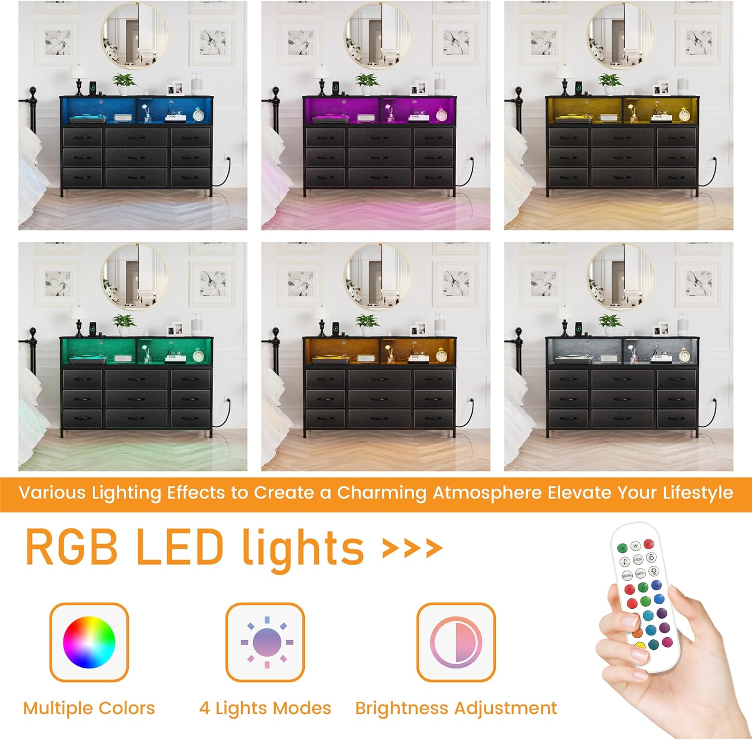 - LED Dresser with Charging Station: The dresser for bedroom with a charging station and LED light, combines functionality with romantic style. You can easily control these LED lights with the included remote control or app to create ambience. Meanwhile, our storage chest of drawers with built-in power outlets(2AC+2USB+1TC), lets you easily charge your phone, lamp and other devices, solve the low battery problem