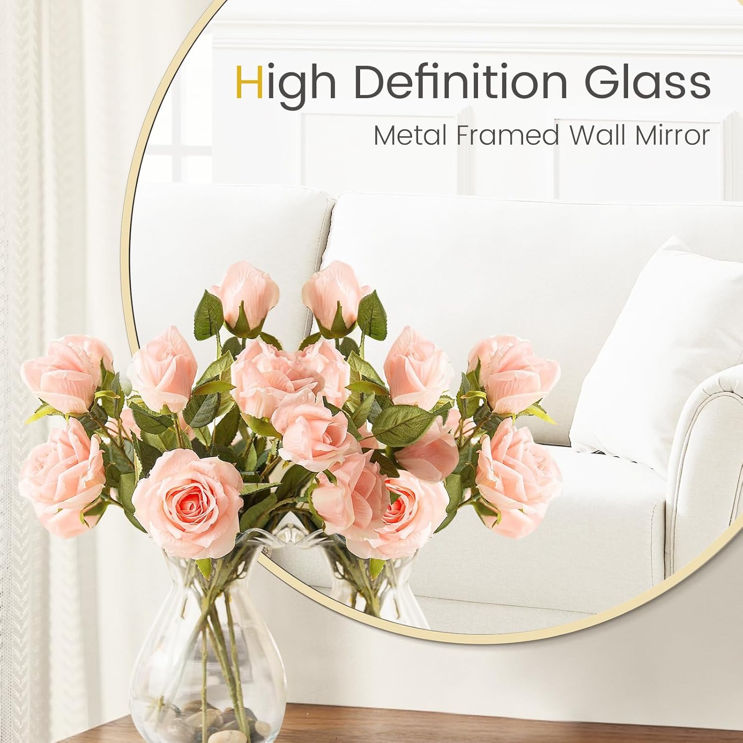 - 【HIGH-QUALITY METAL FRAME】24 inch round mirror is delicately surrounded by a high quality metal frame. The Gold metal frame with the Moisture-proof PVC back panel perfectly combines sturdiness, sophisticated touch, and durability.
