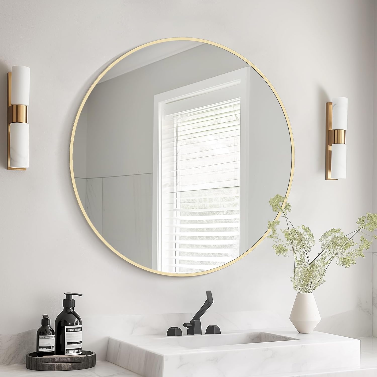 - 【MODERN & LUXURY】Simple and modern design, the gold-colored frame round mirror feel elegant. Suitable for any room, Bathroom, bedroom, living room, corridor, entrance and more.