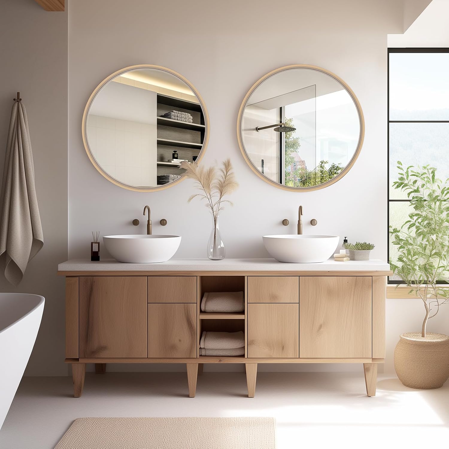 HOMECOOKIN Round Wood Mirror, 24" Round Bathroom Wall Mirror Circle Mirrors for Wall Decor, Vanity, Living Room, Bedroom, Entryway, Natural