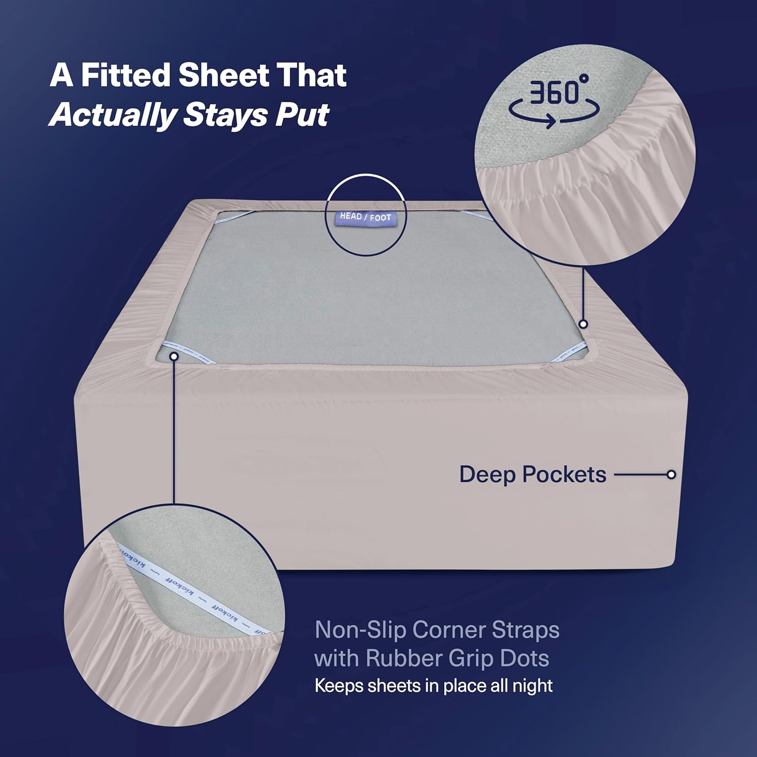 - SleepTight Tech Elastic Straps: Heavy-duty non-slip elastic straps in all four corners of our deep pocket Twin XL sheets bamboo viscose and thick elastic all around ensure a snug and secure fit. Our extra deep pocket fitted sheet is designed to fit mattresses up to 16" inches.