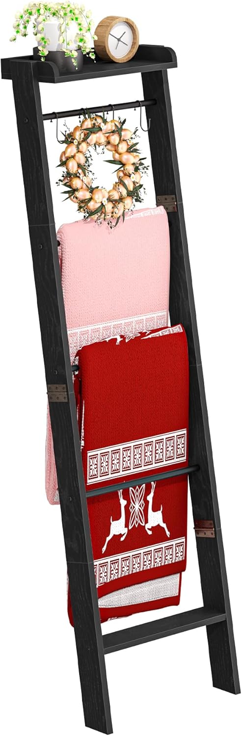 Blanket Ladder Shelf for Living Room, Decorative Quilt Rack with Storage Shelf, 6-Tier Farmhouse Ladder Holder Organizer with 4 Removable Hooks for Bedroom, Black BR35804B