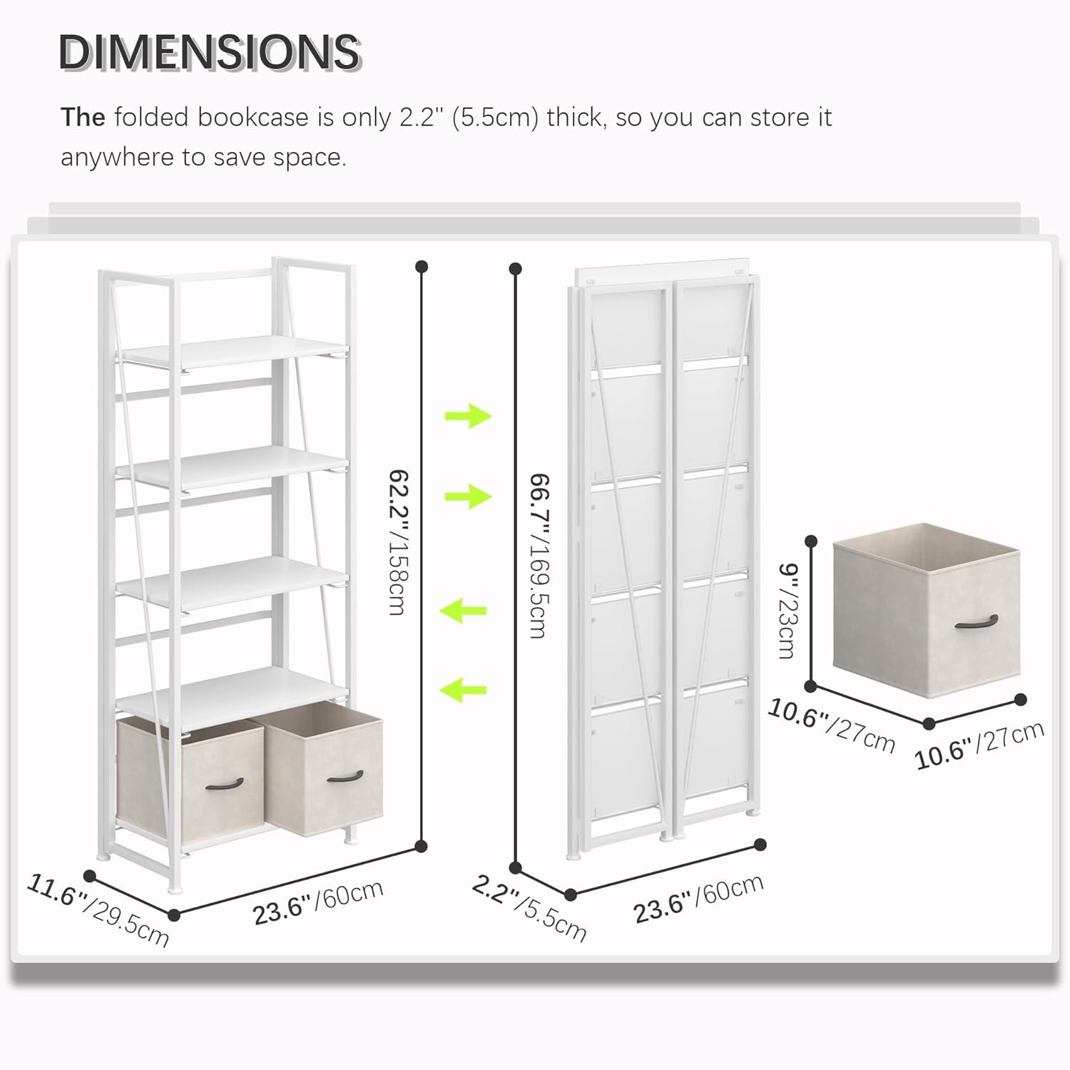 4NM No Assembly Folding Bookshelf, 5-Shelf 62.2" H Collapsible Foldable Bookcase Storage for Small Spaces, All White