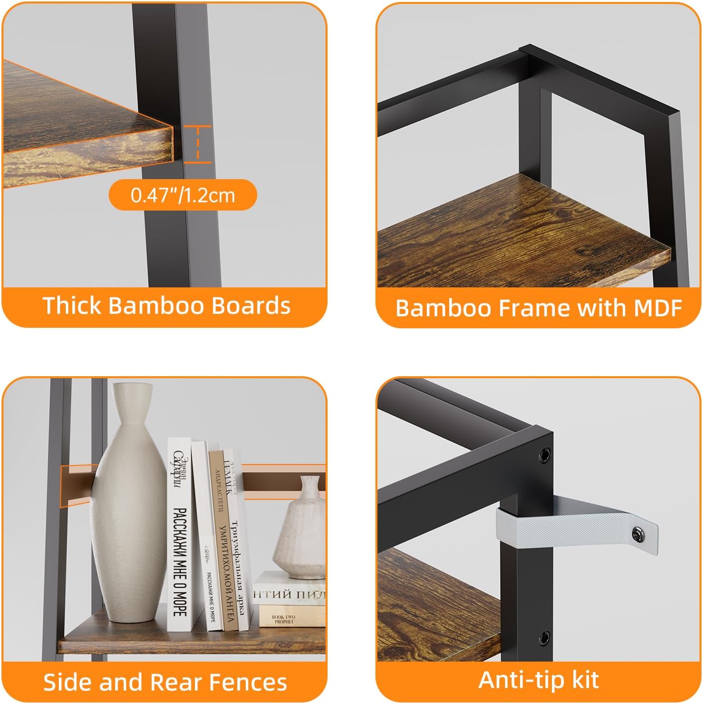 HITNET Ladder Shelf, 4 Tier Bookshelf with Bamboo Frame, Freestanding Bathroom Storage Shelving Unit for Living Room, Home Office, Bedroom, Rustic Brown and Black