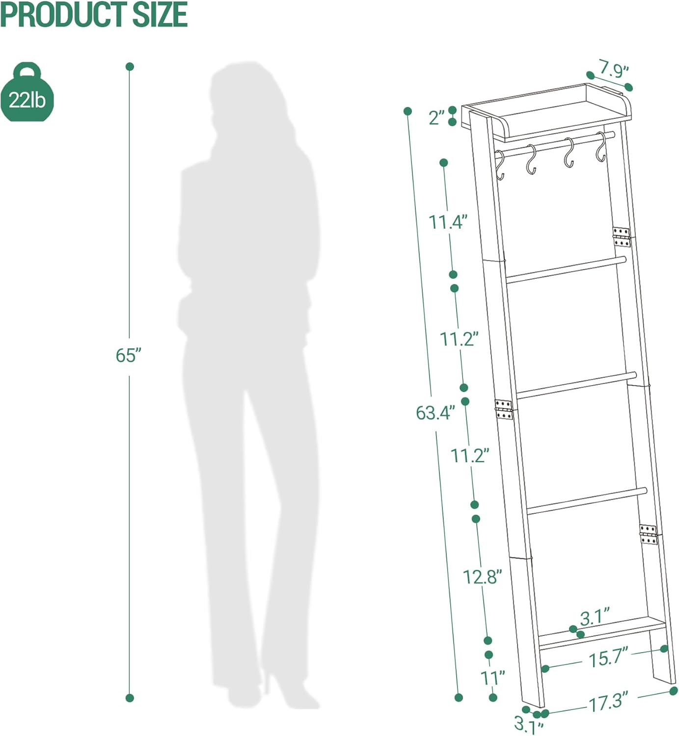 - Space saving decorative ladder: A 6-tier blanket ladder, prop the towel ladder against a wall to store clothes and blankets as a catch-all rack. The top compartment can display aromatherapy or small decorative ornaments. 4 removable hooks make it easier to place your bag keys, etc