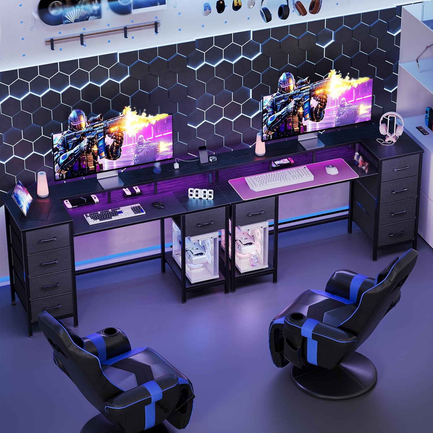 47 Inch Computer Gaming Desk with Power Outlets & LED Lights Reversible Home Office Desk with Adjustable 5 Fabric Storage Drawers for Working Writing Study, Black