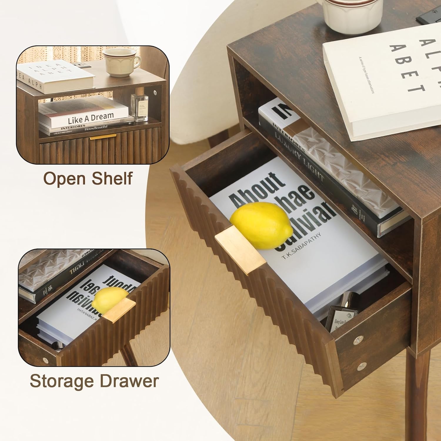 - Ample Storage Space: This modern fluted nightstand offers two levels of storage. The upper level provides open space, ideal for storing reading books, while the lower level drawers ensure the privacy of your belongings. Additionally, the spacious desktop doubles as a display area, adding versatility to your bedside or sofa-side storage needs