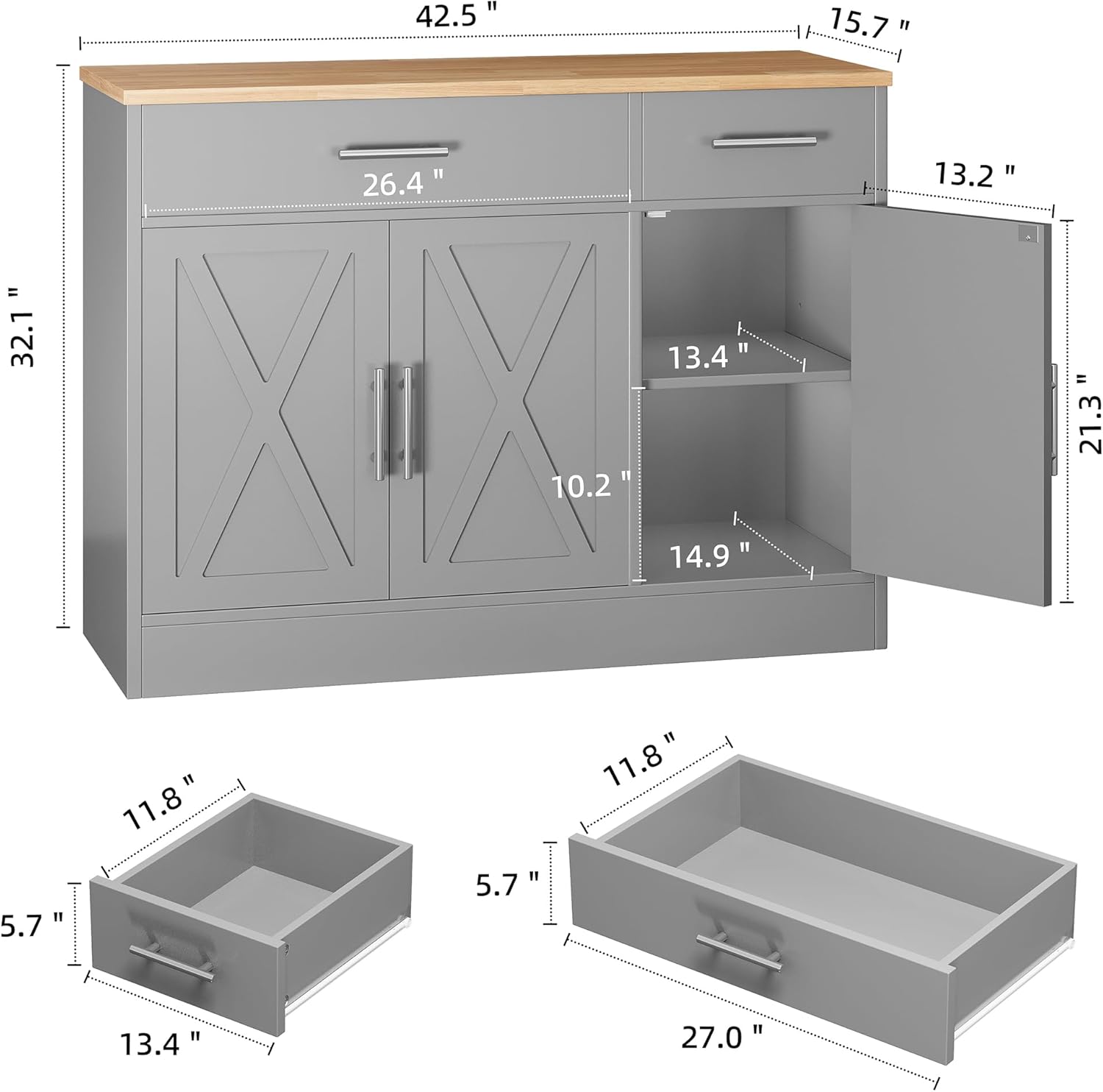 - Quality Material Buffet Cabinet: This sideboard buffet cabinet is crafted from premium manufactured wood and hardware, the buffet cabinet performs excellent stability and incredible durability to serve for years. The tabletop supports up to 180lbs. Overall Dimensions: 15.7"D x 42.5"W x 32.1"H.