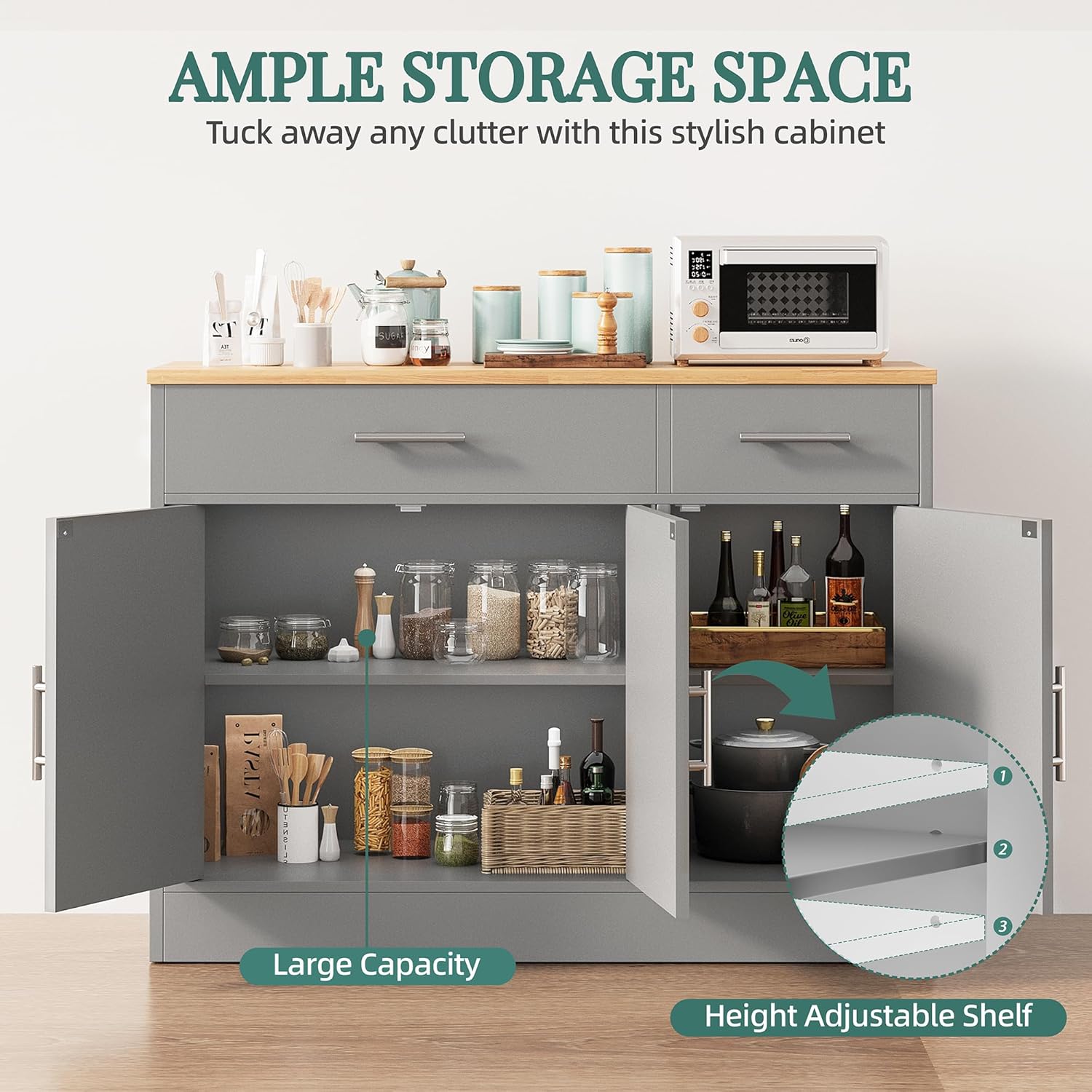 - Large Storage Space Cabinet: The buffet cabinet incorporates both open and closed storage space to meet your different needs. Spacious tabletop can place items for easy access, three handy drawers help classify knives and forks neatly, while two bottom cabinets each with internal shelf offer smart space to accommodate mugs, extra dishware, and other essentials.
