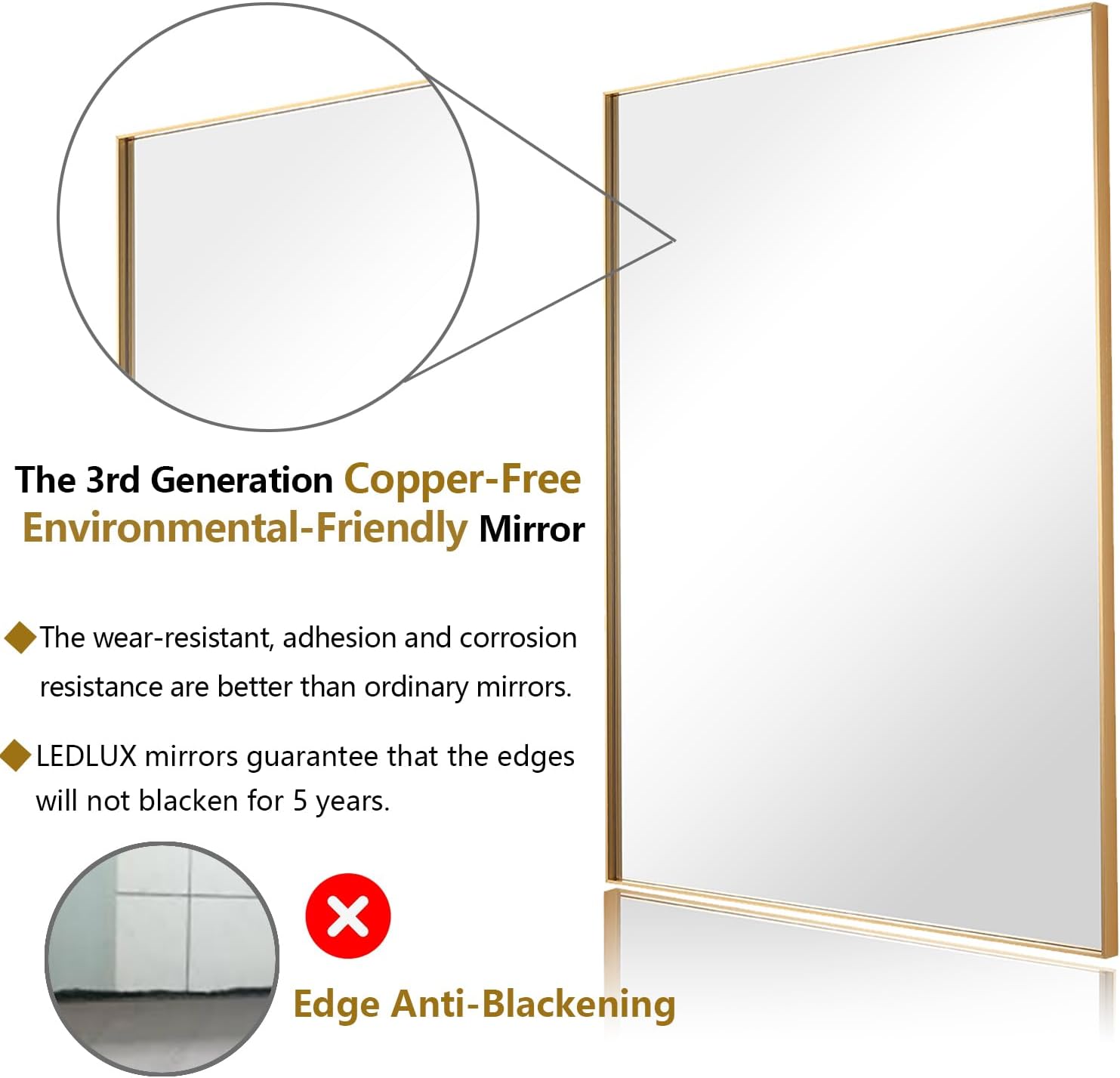 - 【5-Year Guarantee】 - LEDLUX gold vanity mirrors are lead-free and copper-free, offering superior corrosion resistance and durability compared to ordinary bathroom wall mirrors. With 1:1 distortion-free high-definition reflection and over 99% color accuracy, our mirrors provide true-to-life clarity. We guarantee the edges will not blacken for at least 5 years.
