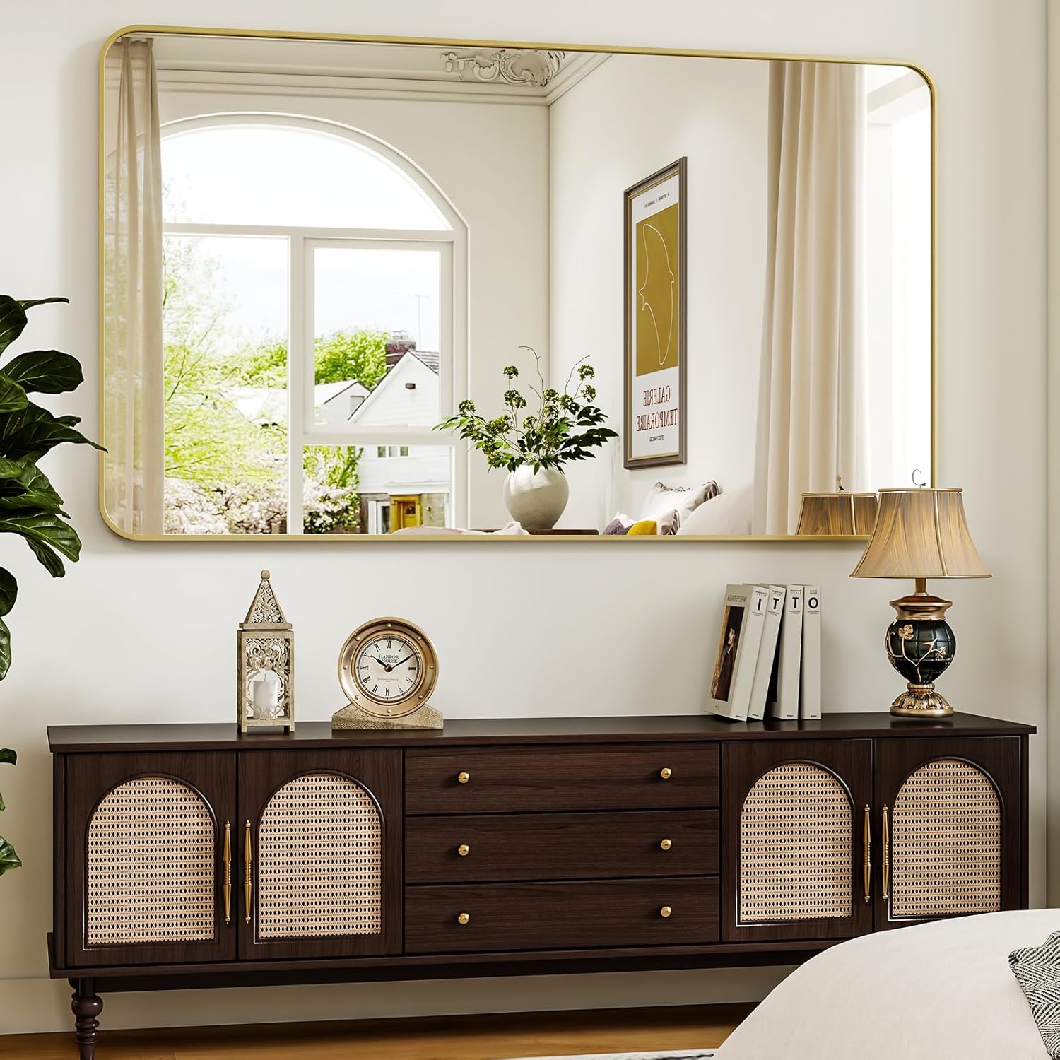 30 x 48 Inch Bathroom Mirror, Rounded Rectangular Vanity Mirror for Wall, Modern Mirror for Room Decor, Gold Framed Wall-Mounted Mirrors for Home Decor, Hangs Horizontally or Vertically