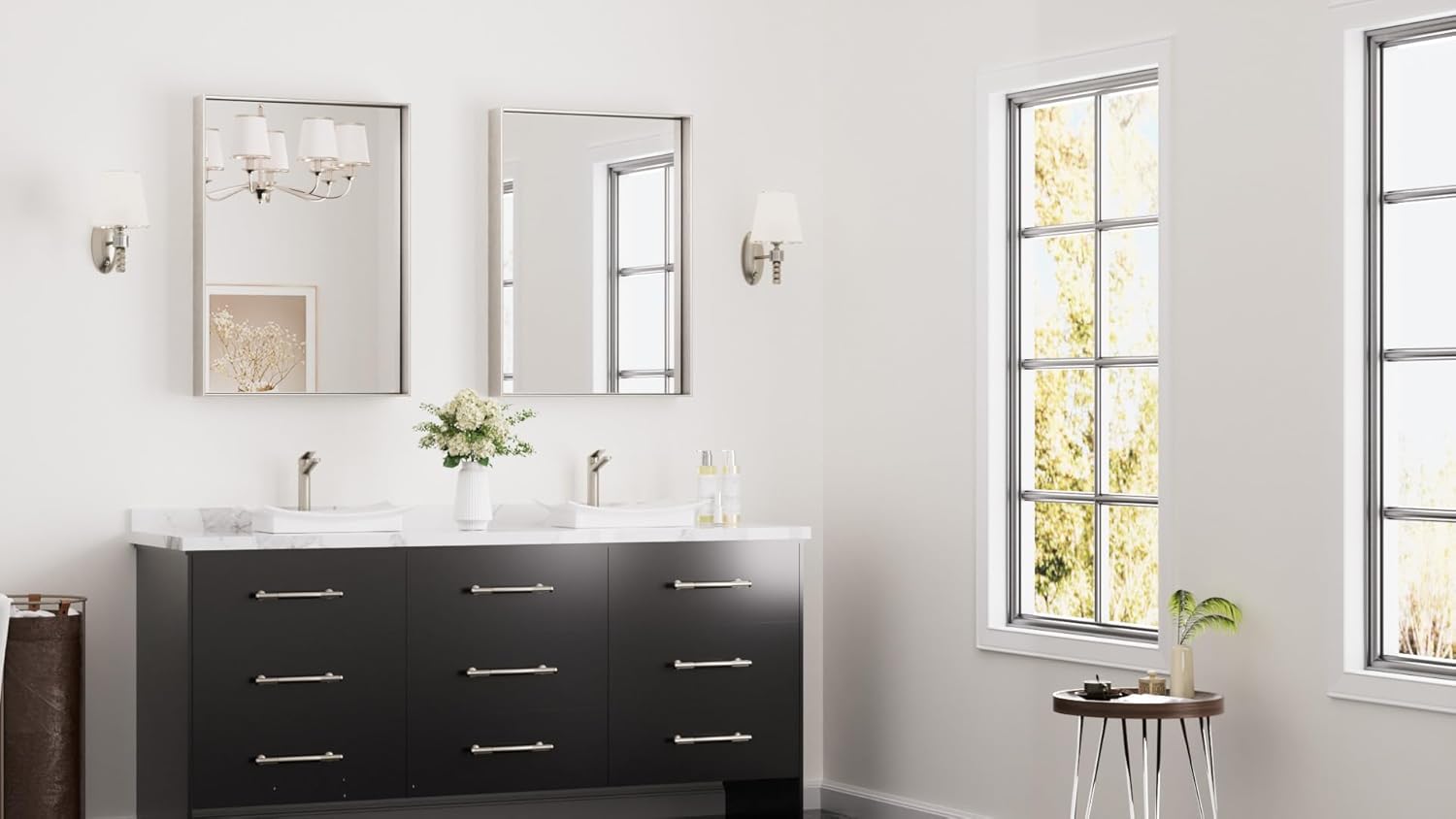 - 【Exceptional Quality】Our brushed nickel rectangle bathroom mirror is made of HD 5mm glass, bright and anti-distortion, which provides excellent reflection. Aluminum alloy frame and PVC shatterproof film would strengthen the floating glass for safety, waterproof and anti-corrosion in wet bathroom environments.