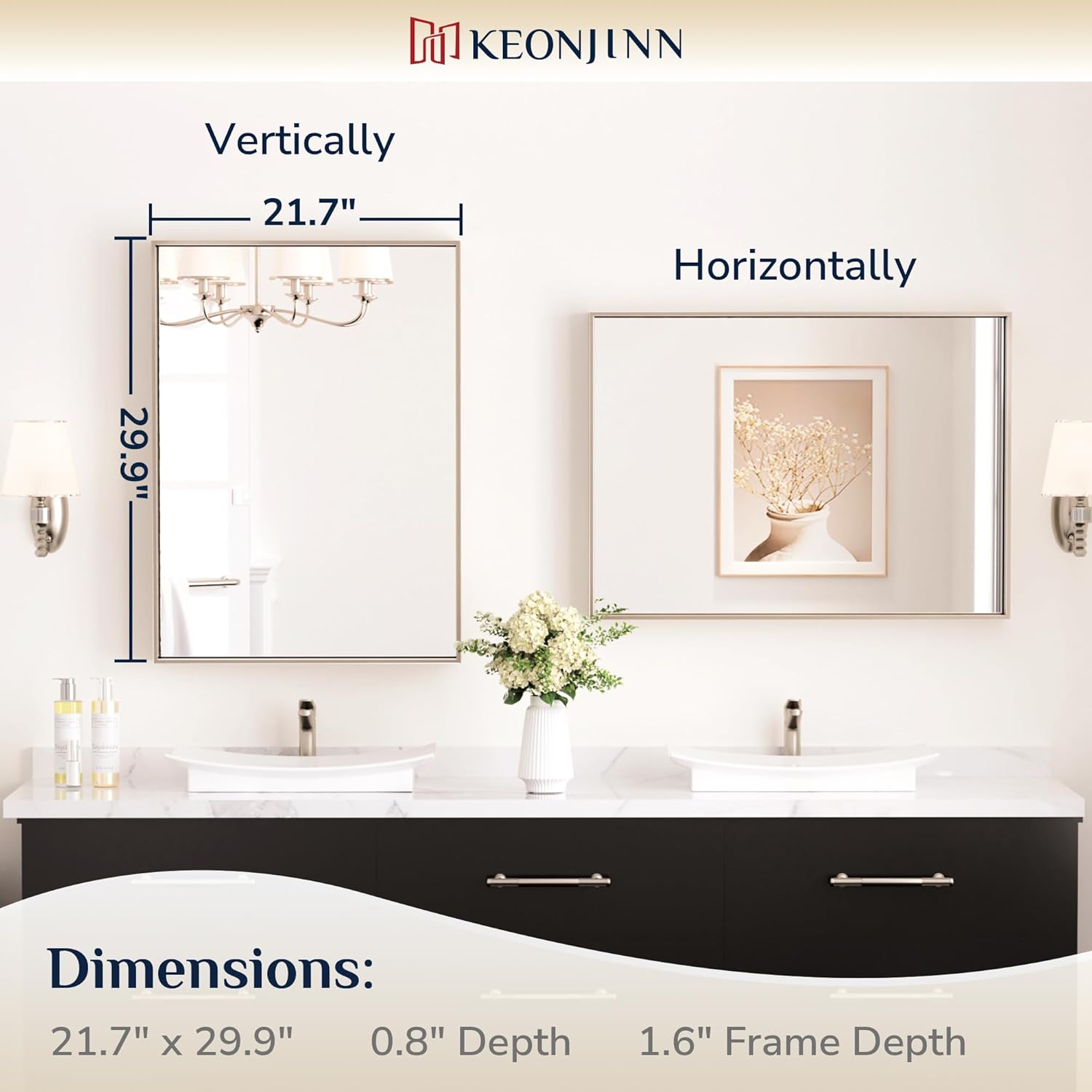 Keonjinn Brushed Nickel Bathroom Mirror for Wall 22 x 30 in, Rectangular Metal Framed Silver Mirror for Vanity Square Corner Aluminum Alloy Rectangle Modern Mirror for Over Sink(Horizontal/Vertical)