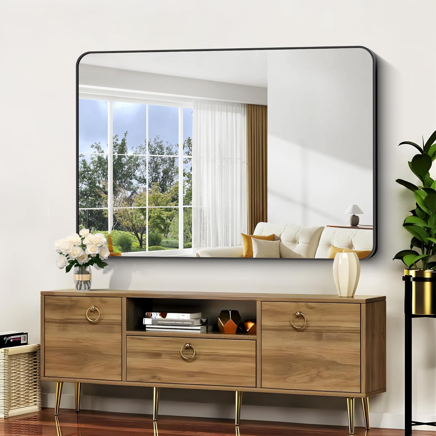 Bathroom Mirror, 55x36 inch Black Rectangle Wall Mirror, Metal Frame Rounded Corner Vanity Mirror, Large Wall Mounted Mirrors for Over Sink Bedroom Living Room Horizontal Or Vertical Mounting