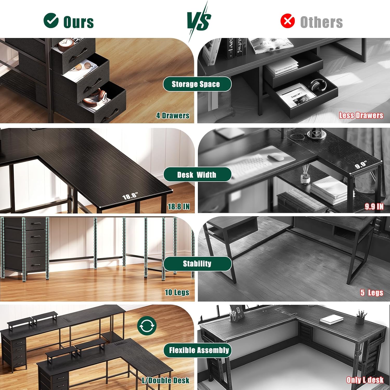 59 inch L Shaped Computer Desk with Power Outlets, Home Office Desk with 4 Adjustable Storage Drawers & 2 Monitor Stands, Two Person Gaming Table for Bedroom, Black