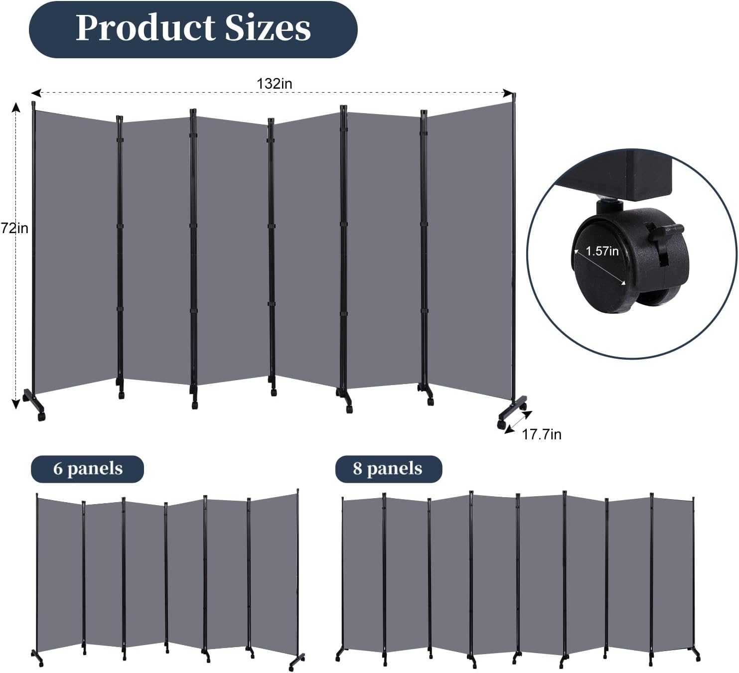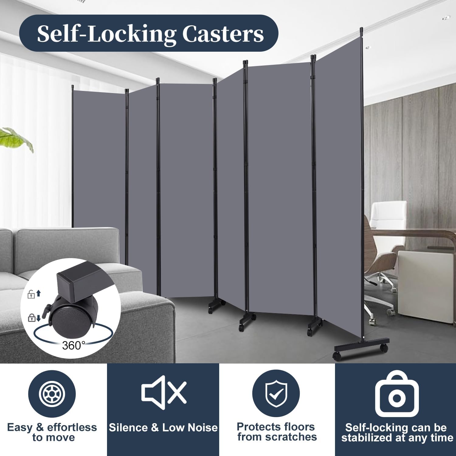 - Free Moving Room Divider Screens: Self-lockable universal wheels allow you to move room dividers effortlessly and freely. Each wheel equipped with self-contained brake, which allows room divider stand firm anywhere and no sliding. PE material wheels also protect your floor while keep silence.