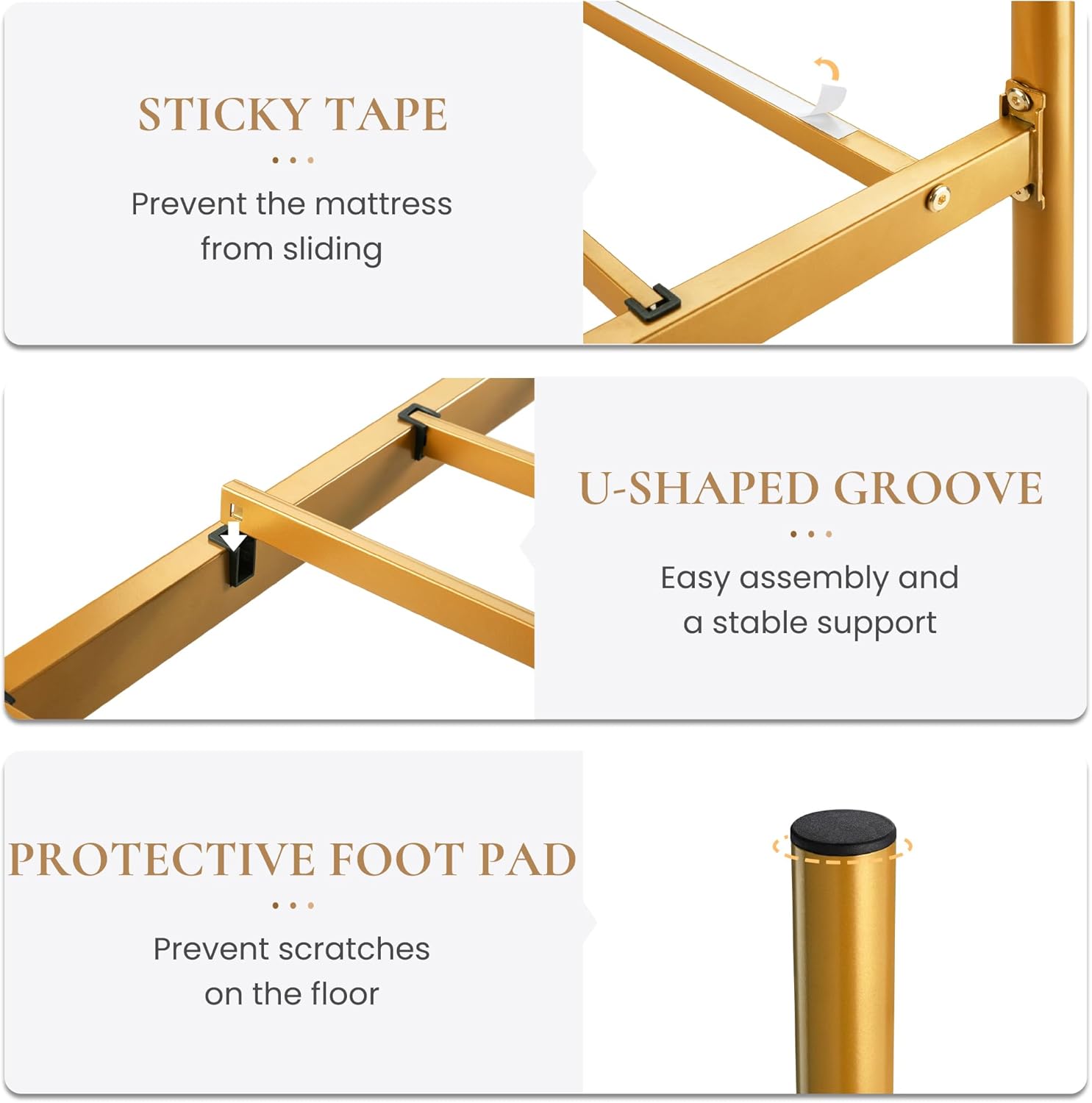 - Noise-Free: The gold bed frame provides an EVA sponge to help cushion the contact between slats and reduce potential noise caused by friction. Greatly improve the quality of sleep by minimizing disturbances from creaking or rattling sounds
