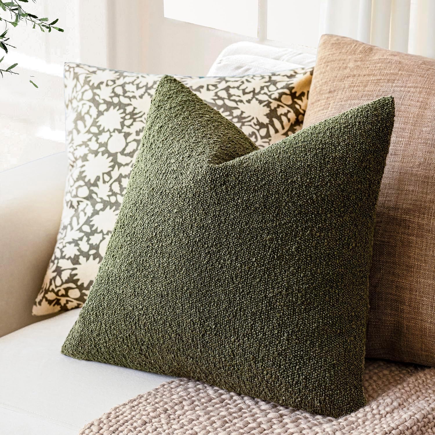 Foindtower Pack of 2, Decorative Textured Boucle Throw Pillow Covers Neutral Accent Solid Pillow Cases Cozy Soft Couch Cushion Case for Chair Sofa Bedroom Living Room Home Decor 22x22 Inch Moss Green