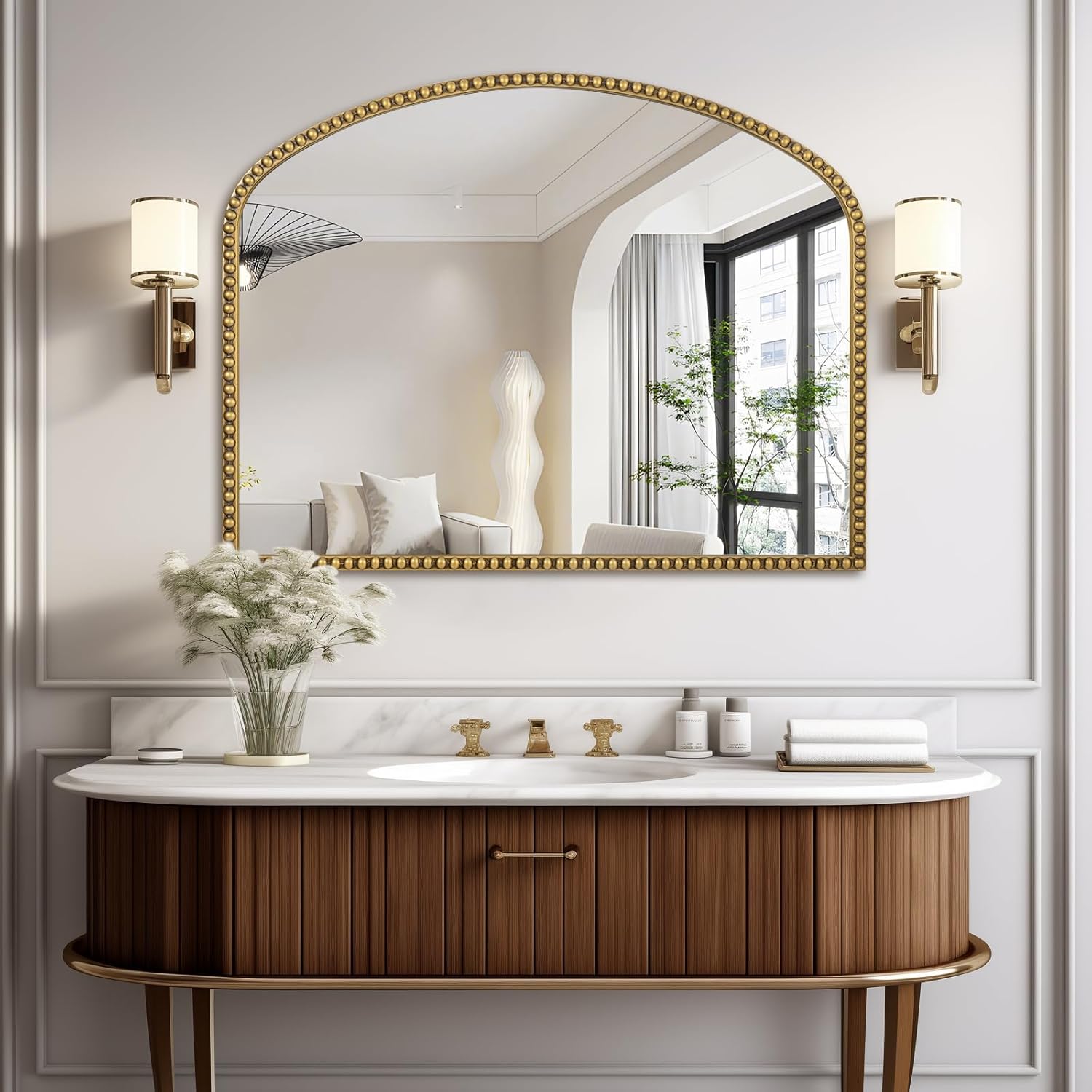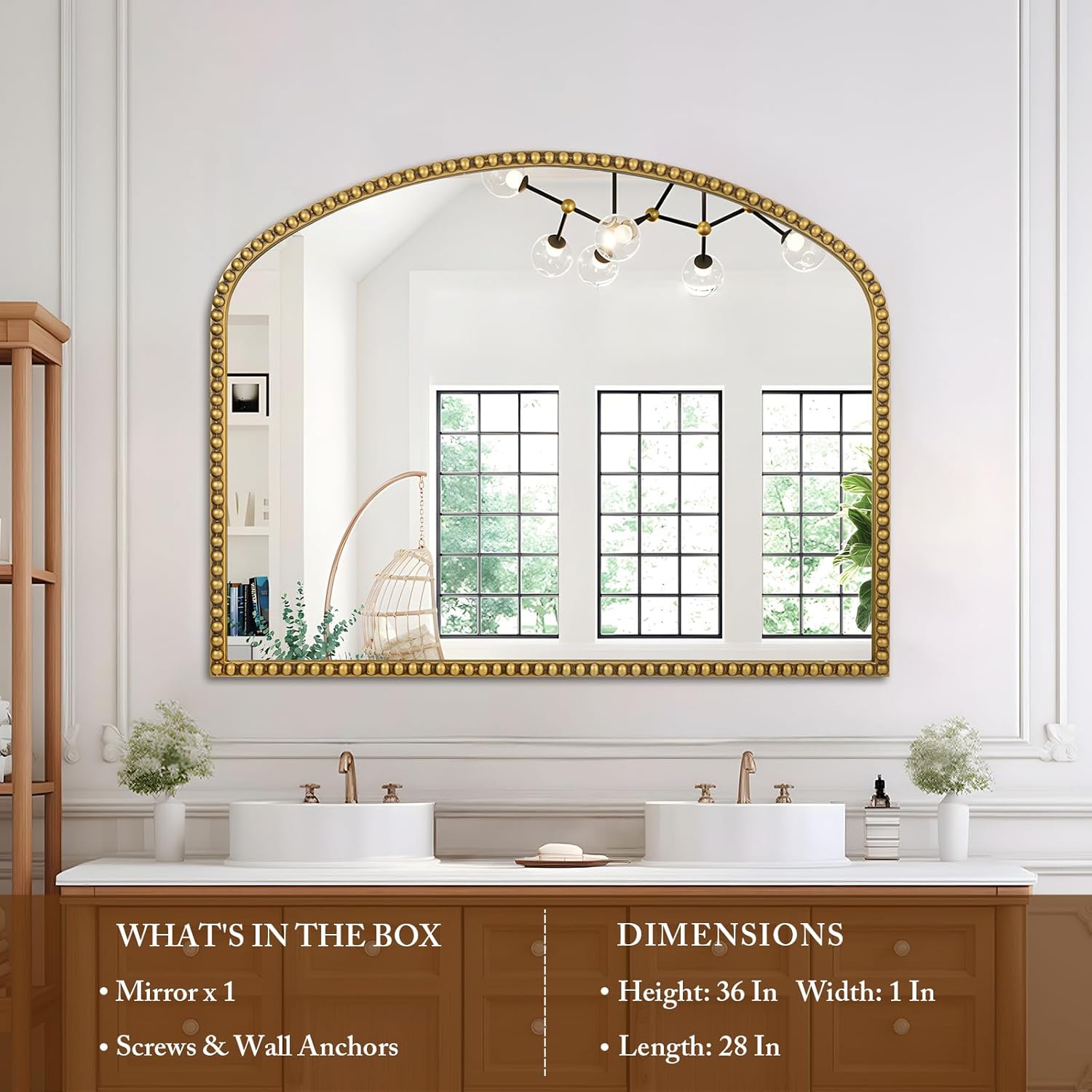28"x36" Large Arch Wall Mirror, Decorative Beaded Frame Hanging Vanity Mirror for Dresser, Bathroom, Entryway, Bedroom, Mantel, Antique Gold