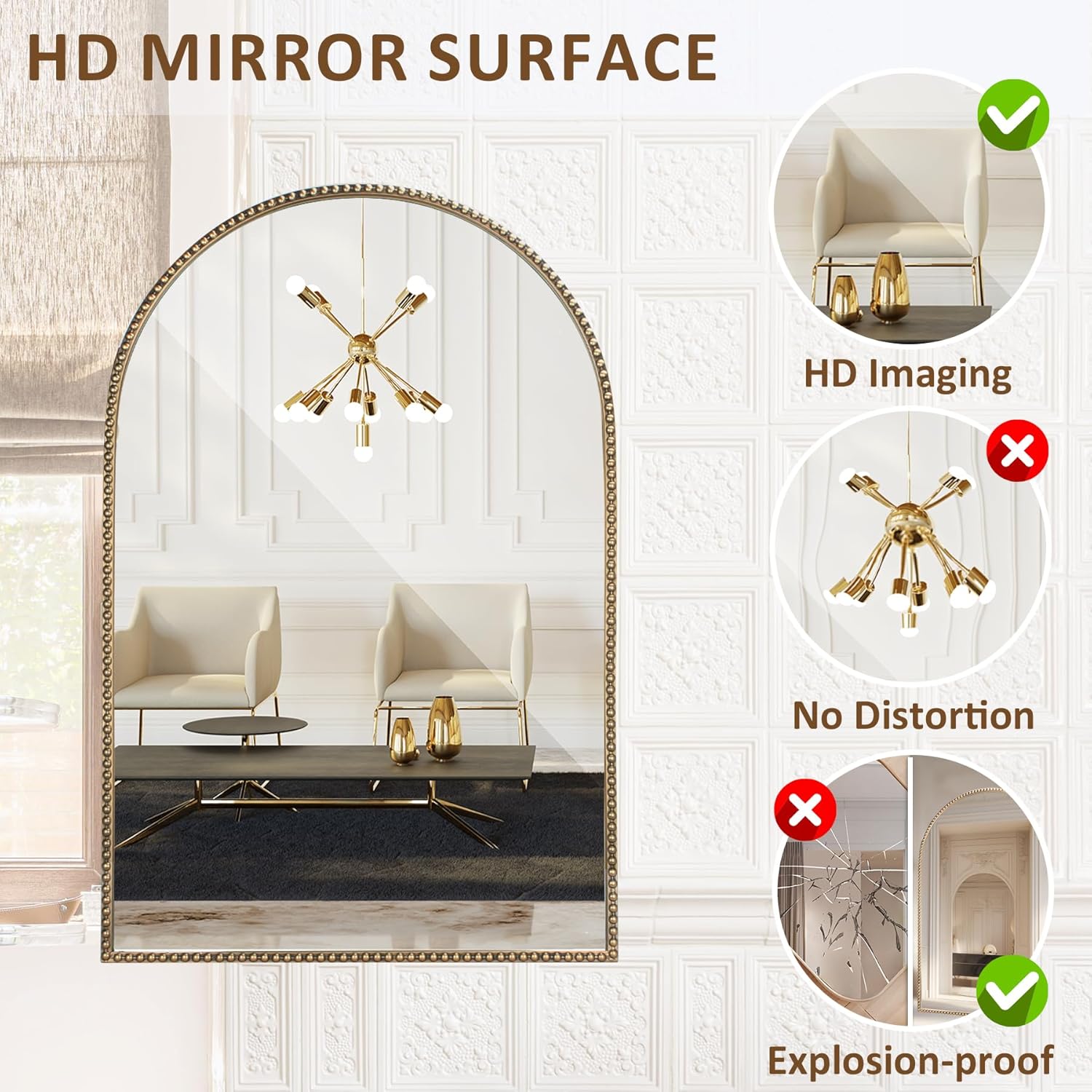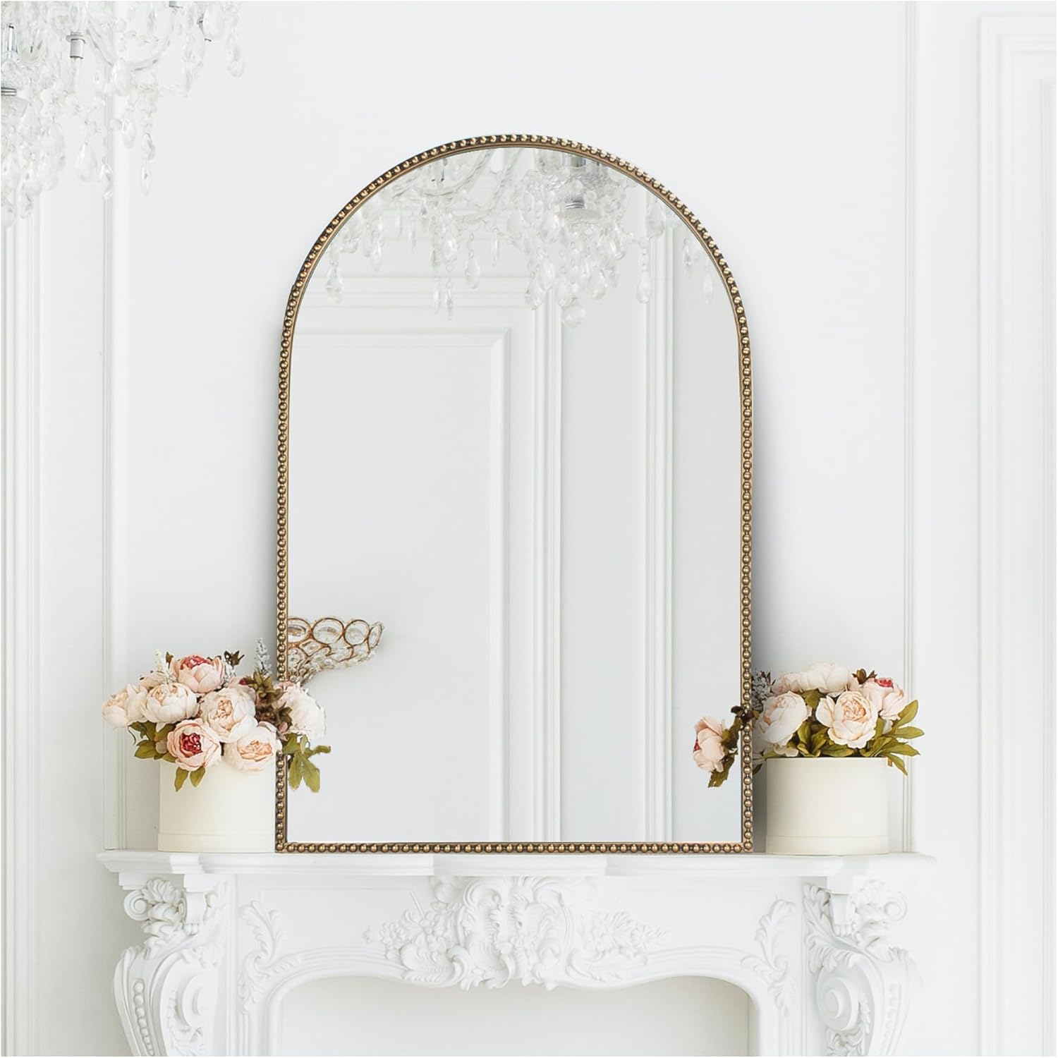 Antique Gold 24"x36" Arched Wall Mirror with Metal Beaded Frame - Decorative Accent Wall Mirror for Bathroom, Bedroom, Living Room, Entryway