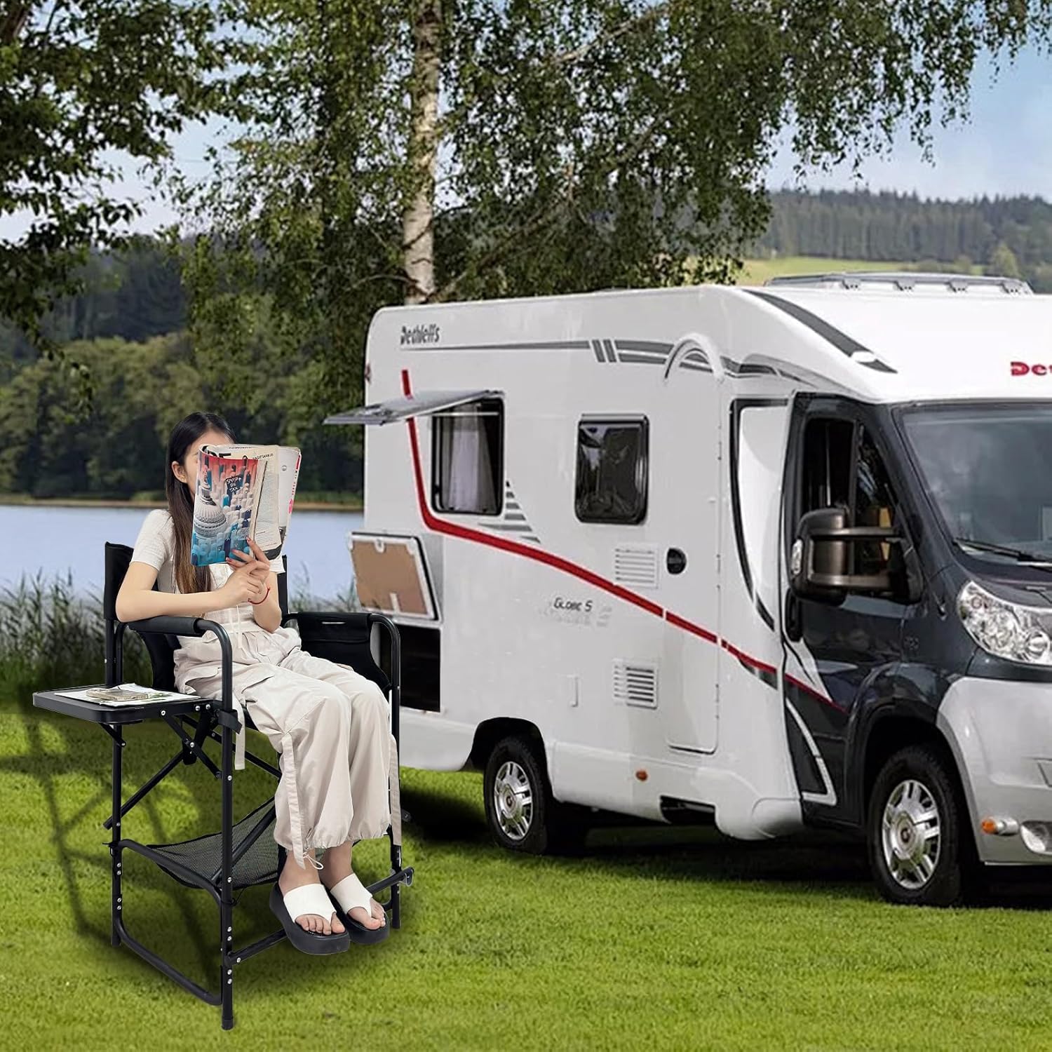 Tall Folding Directors Chair with Side Table 26.77" Seat Height Foldable Camping Chair Bar Stool for Makeup Artist Face Painting with Footrest and Storage Pocket Supports 350LBS