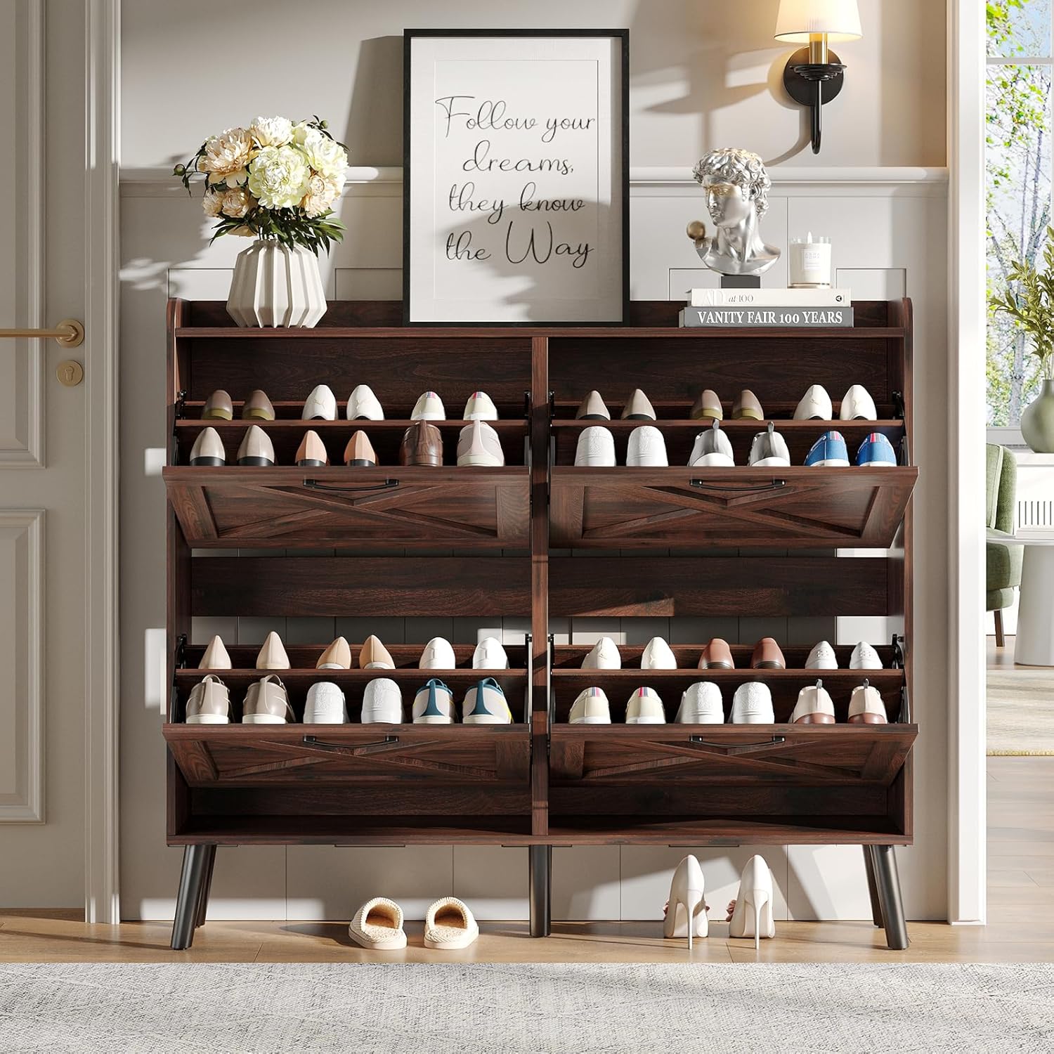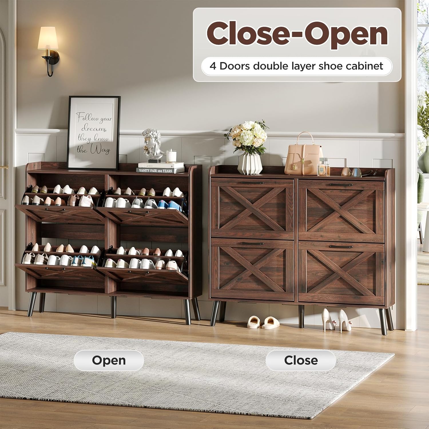 - Entryway Shoe Cabinet: The hidden shoe storage cabinet with 4 flip doors, stylish and simple dark walnut makes it a neat and beautiful finish and looks great in many different home styles. Perfect for placing in the entryway, hallway, living room, or porch, provides a neat looking in your home and space saving
