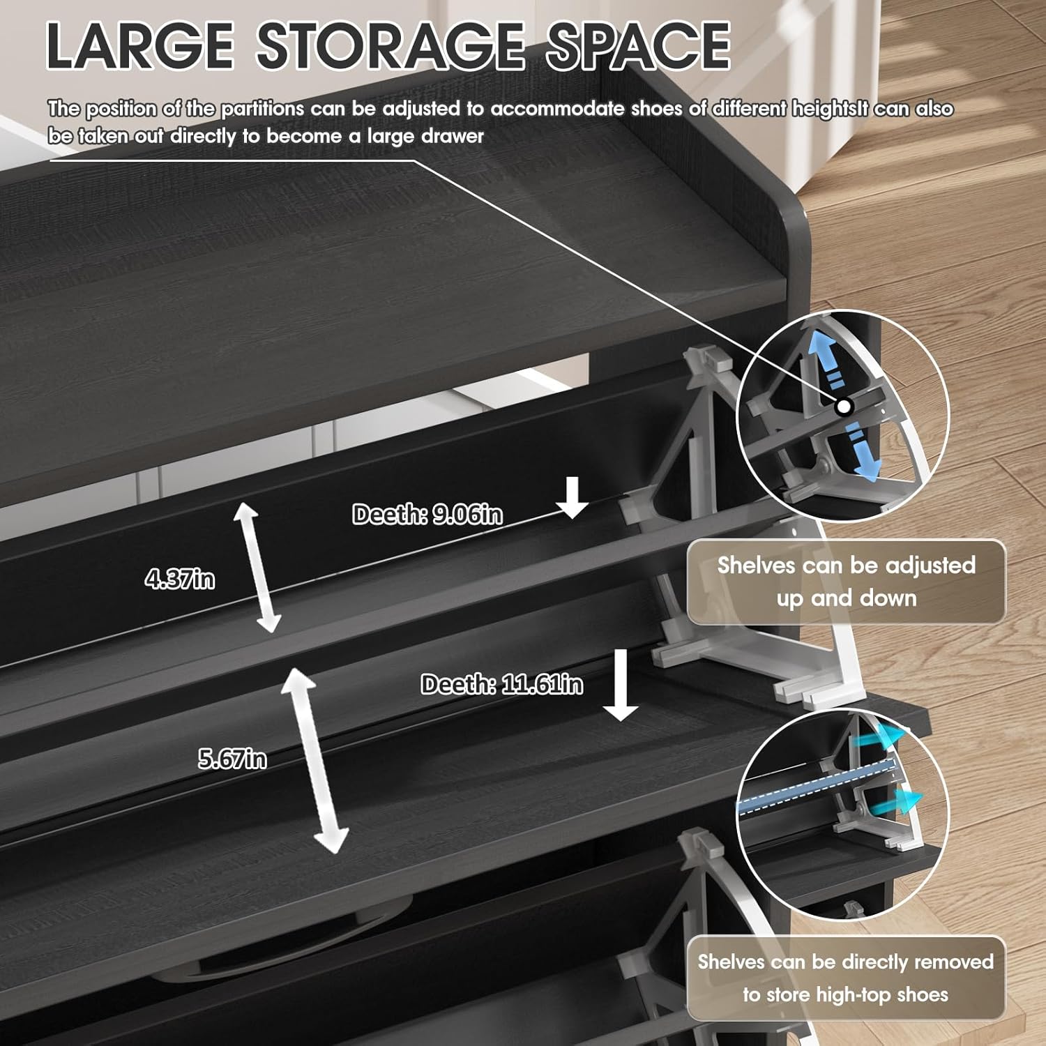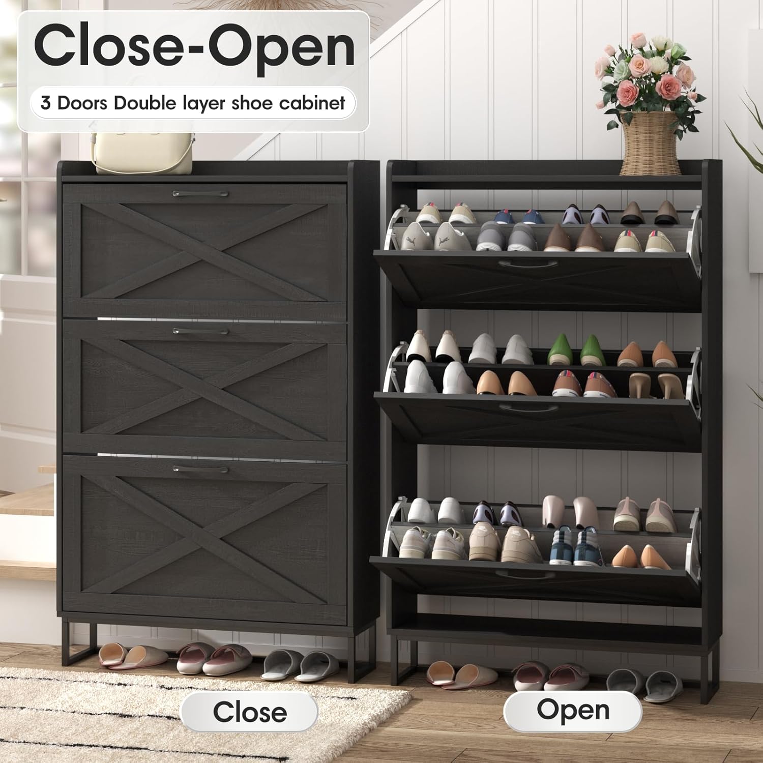 - Entryway Shoe Cabinet: The hidden shoe storage cabinet with 3 flip doors, stylish and simple black makes it a neat and beautiful finish and looks great in many different home styles. Perfect for placing in the entryway, hallway, living room, or porch, provides a neat looking in your home and space saving
