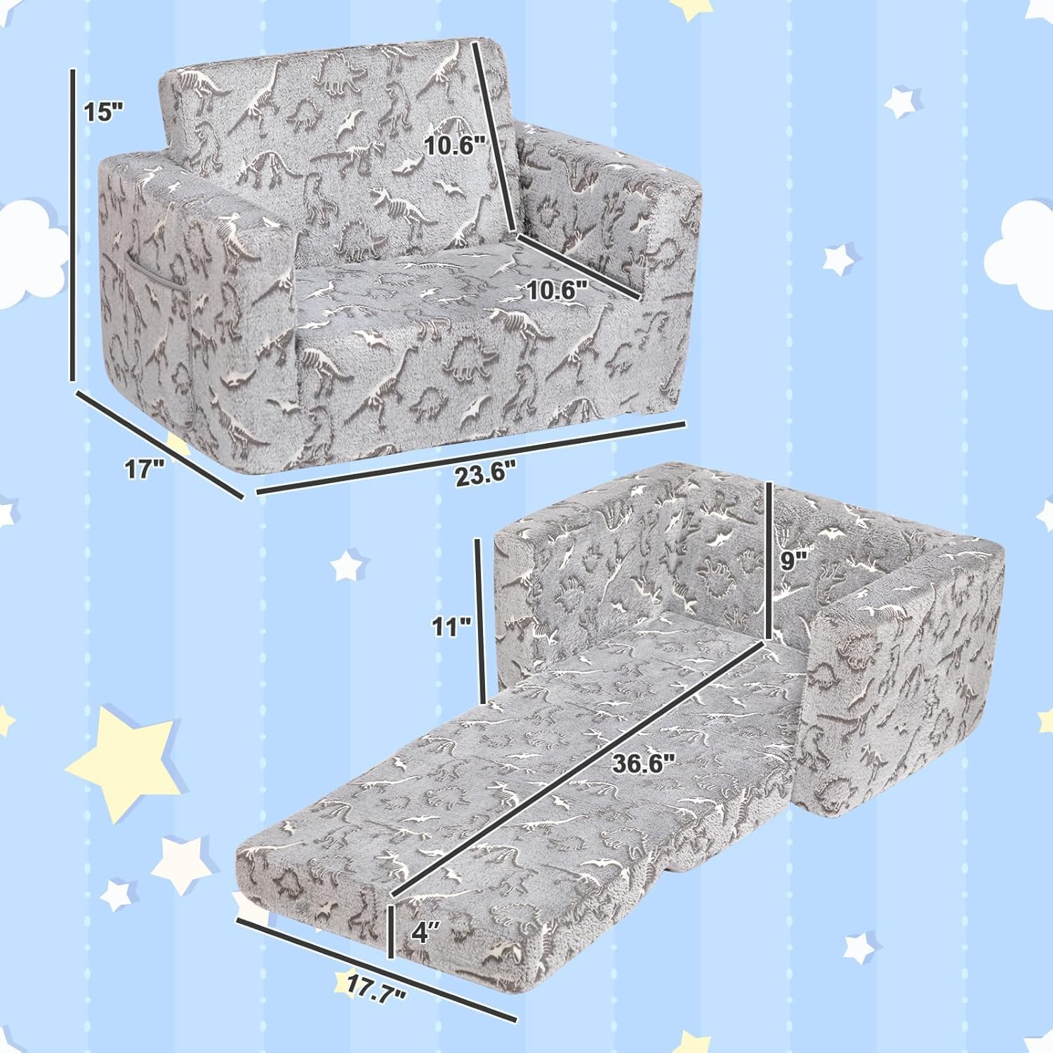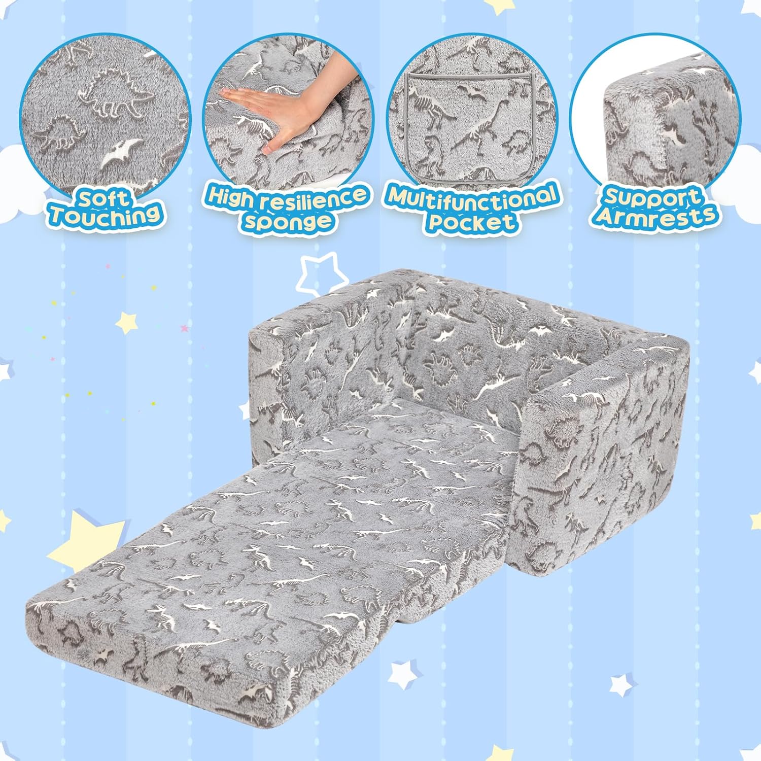 ALIMORDEN 2-in-1 Flip Out Cuddly Sherpa Toddler Couch, Convertible Sofa to Lounger, Glow in The Dark,Dinosaurs