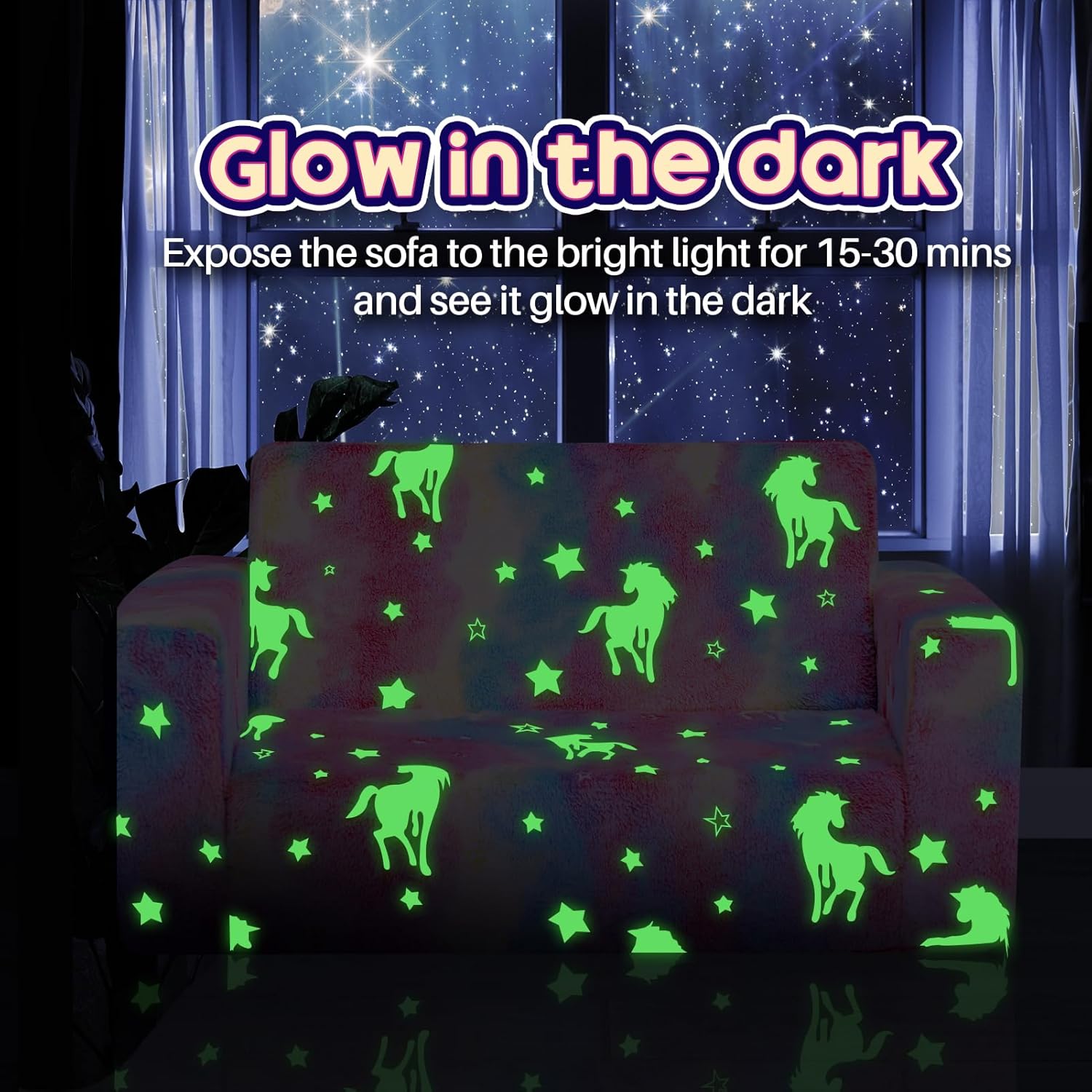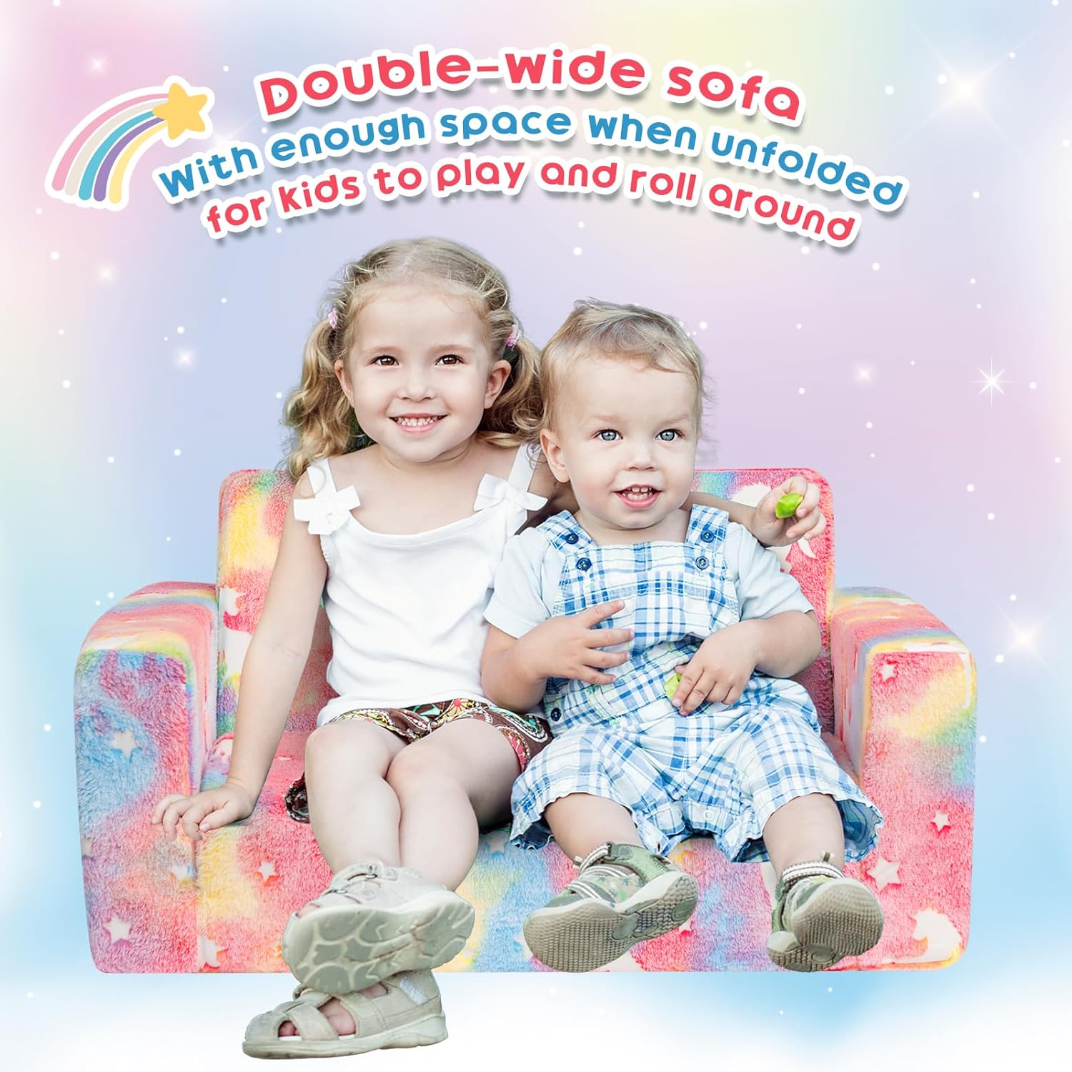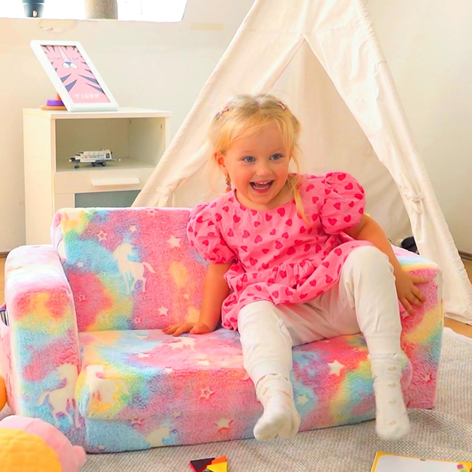 ALIMORDEN Fold Out Toddler Couch, Extra Wide Comfy 2-in-1 Cuddly Sherpa Sofa for Kids, with Removable Baby Friendly Blanket, Convertible Sofa to Bed, Unicorn