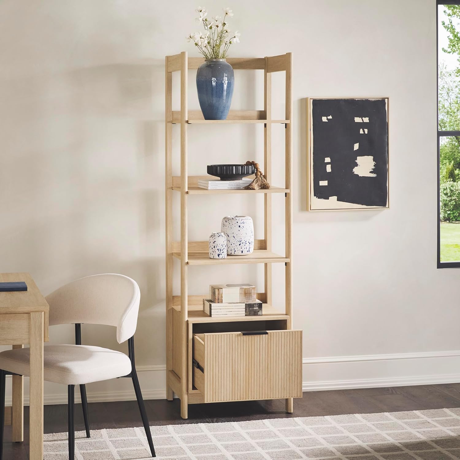 Walker Edison Transitional Reeded Narrow Open Bookshelf with Drawer Home Office Living Room, Bedroom, 4-Shelf Bookcase with Bottom Storage, 22 Inch, Coastal Oak